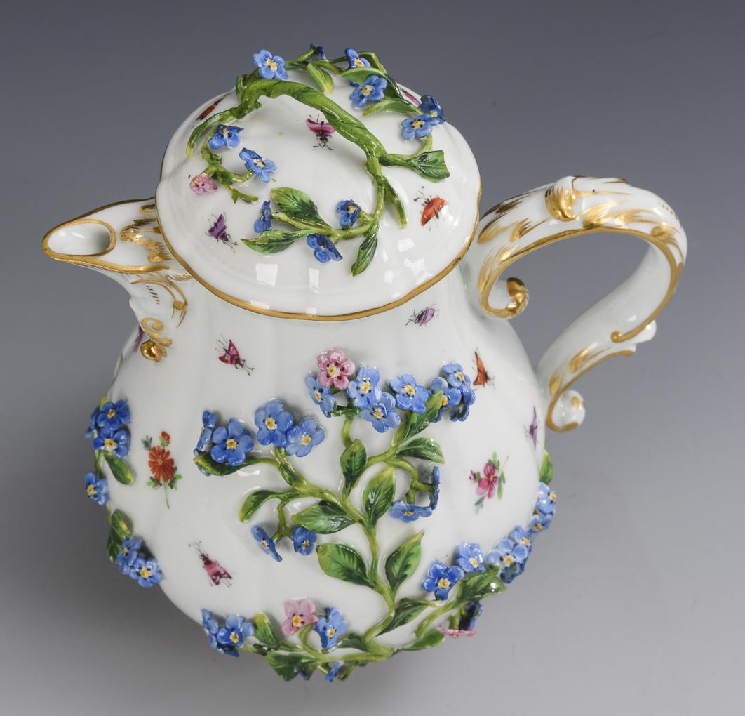 Reich mit Vergissmeinnichtzweigen belegte Birnkanne mit Streublümchen- und Insektenmalerei. Bestoßungen und Farbretuschierungen am Belag, Deckelgriff restauriert.