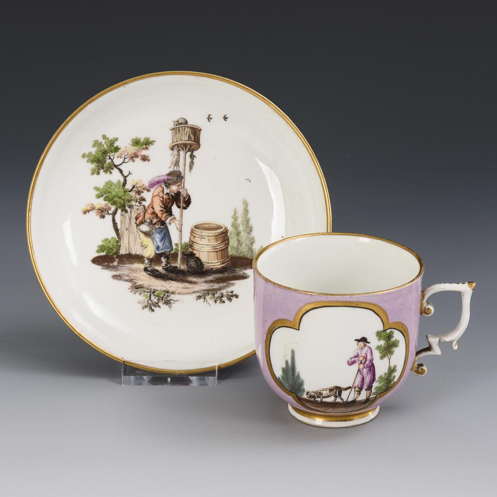 Glockentasse mit Rocaillehenkel. Hellvioletter Fond, beidseitig auf der Tasse eine Kartusche mit der Darstellung eines Schäfers mit Schaf, im Spiegel der Untertasse die Darstellung eines Rattenfängers. Haarriss und Bestoßung am Henkel.