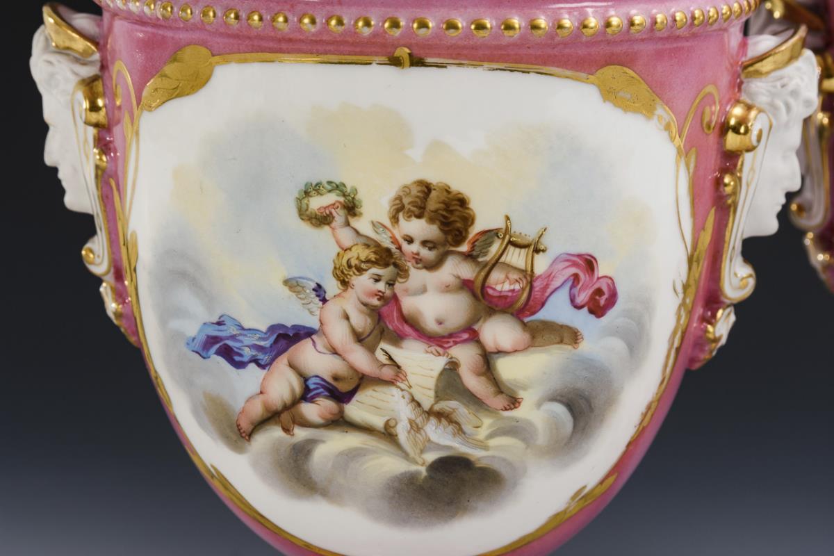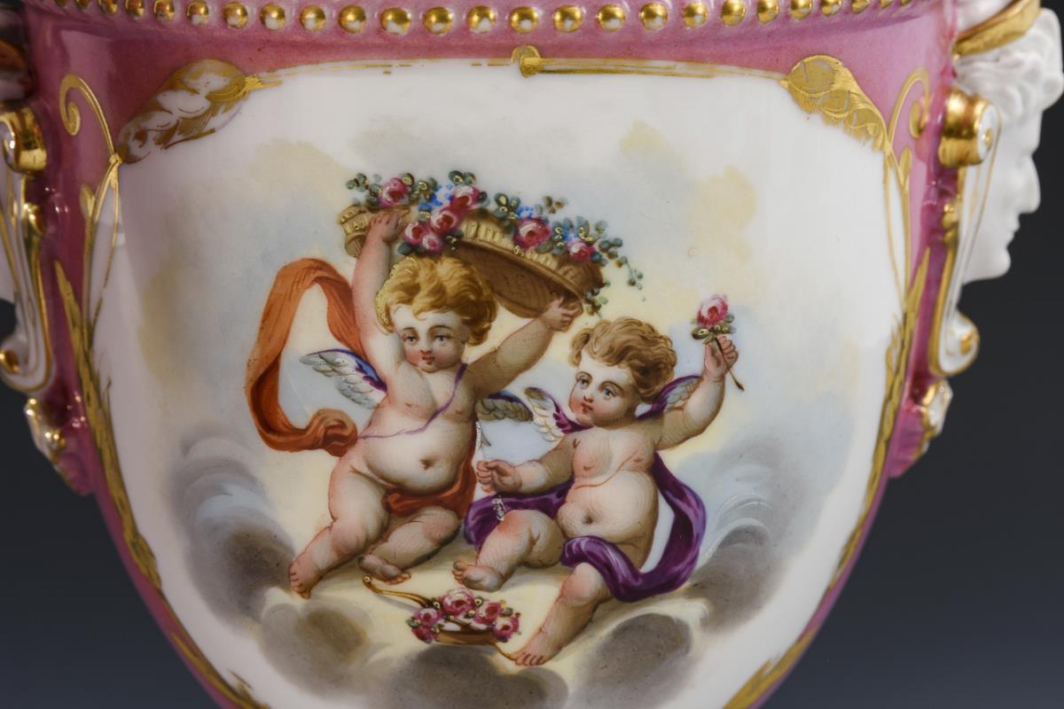 Halbovoider Korpus mit zwei Biskuitmaskaronhandhaben, durchbrochenem Knaufdeckel und Rundfuß, auf Quadratplinthe. Rosa Fond, schauseitig ein goldgerahmtes Medaillon mit der Darstellung zweier Putten auf einer Wolke, verso Blumenmalerei. Minimaler Goldabrieb, Bestoßung an 1 Fußrand, 1 Knauf geklebt.