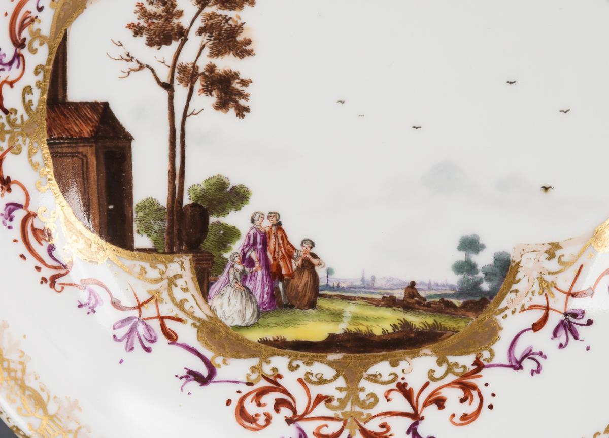 Koppchen und Untertasse mit Goldspitzenbordüre, in von Bandelwerk gerahmten Vierpasskartuschen die Darstellung von weiten Landschaften mit Figurenstaffage. Gold berieben.