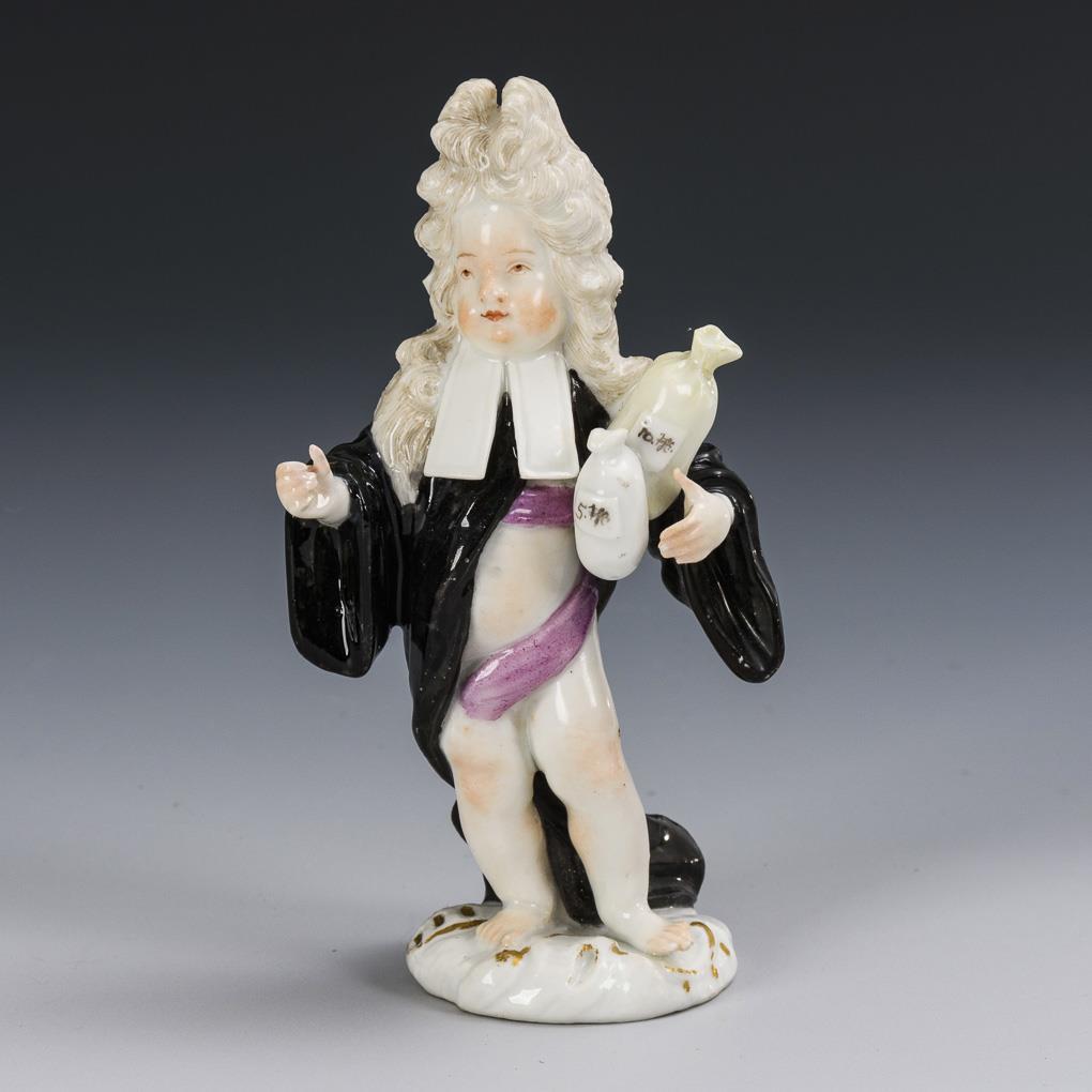 Putto mit Talar und Beffchen sowie zwei Flaschen. Rechter Arm und partiell Talar restauriert, 1 kleine zusätzl. Restaurierung am Zipfel des Geldsacks + 2 kleine Bestoßungen am Mittelfinger rechts + Sack.