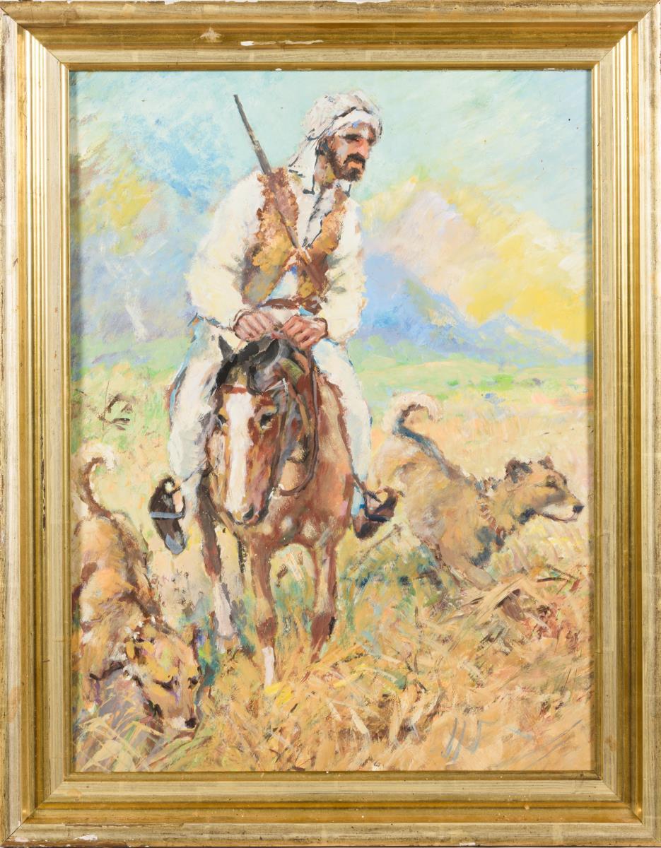 Orientalischer Jägersmann zu Pferd mit Spürhunden im hohen Gras vor dem Gebirgszug.