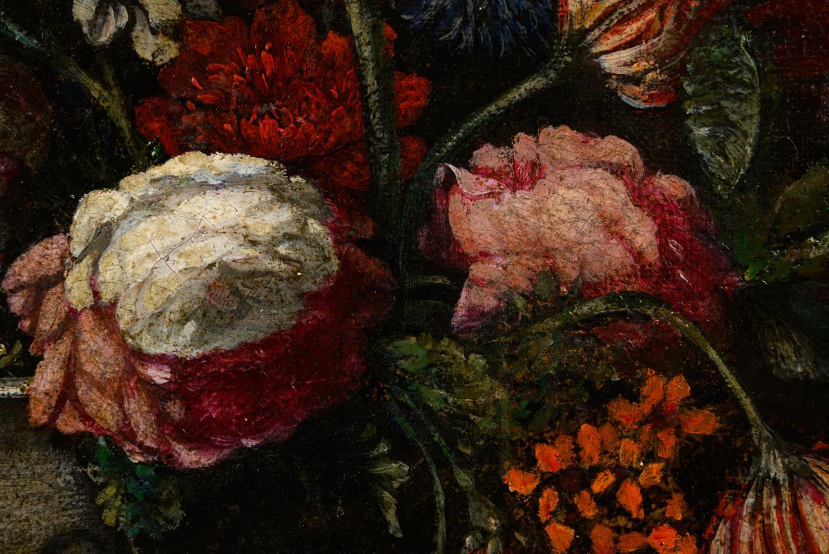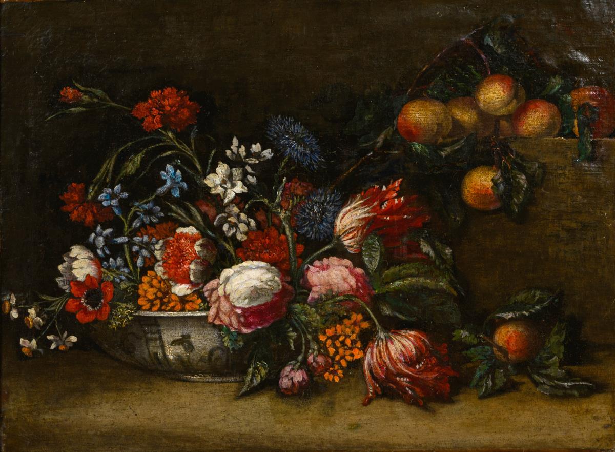 Nelken, Tulpen, Rosen und andere Blumen in einer Schale neben Pfirsichen. Drei kleine restaurierte Stellen mit Hinterklebungen.