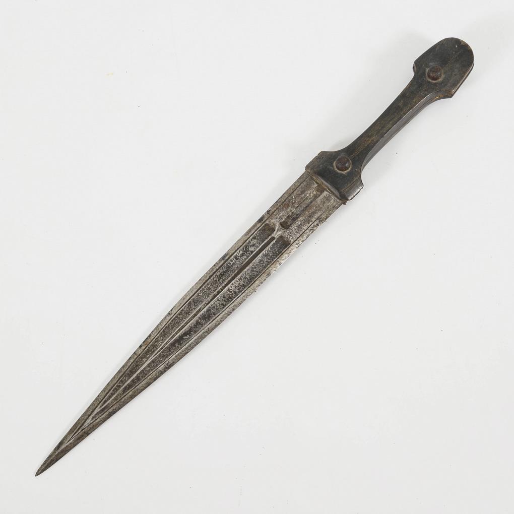 Zweischneidige Klinge mit Spitze in der Mittellinie. verschiedene Hohlschliffe, darin schöne Ätzmuster. Griff aus Hornschalen. Holzscheide mit Lederbezug und einer Öse.