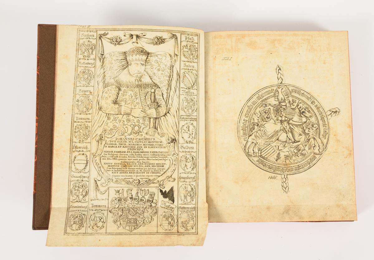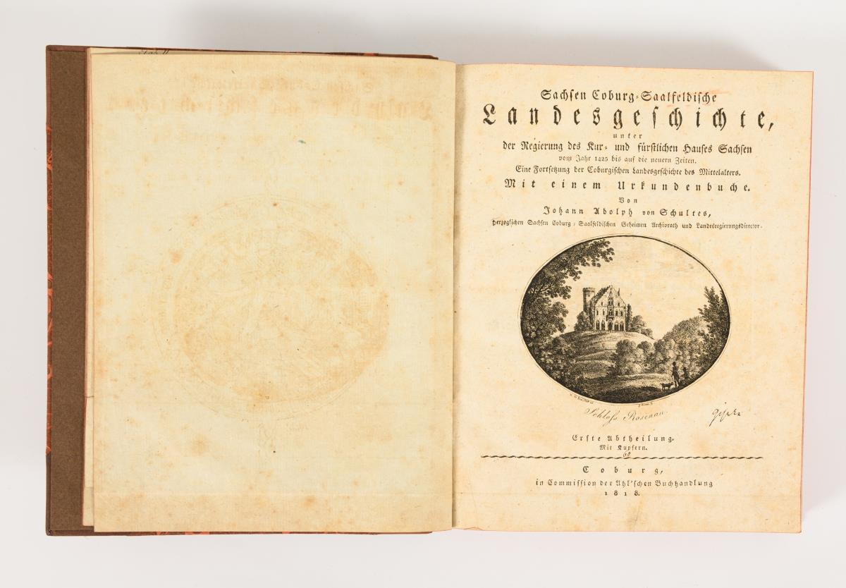 "... des Mittel-Alters mit einem Urkundenbuch" und "..."... unter der Regierung des Kur- und fürstlichen Hauses Sachsen vom Jahr 1425 bis auf die neuen Zeiten, eine Fortsetzung ...". Insgesamt mit drei Tafeln und jeweils unterschiedlichen Titeldarstellung. Rotschnitt, im Pappeinband. 2 Bücher jünger nachgebunden.