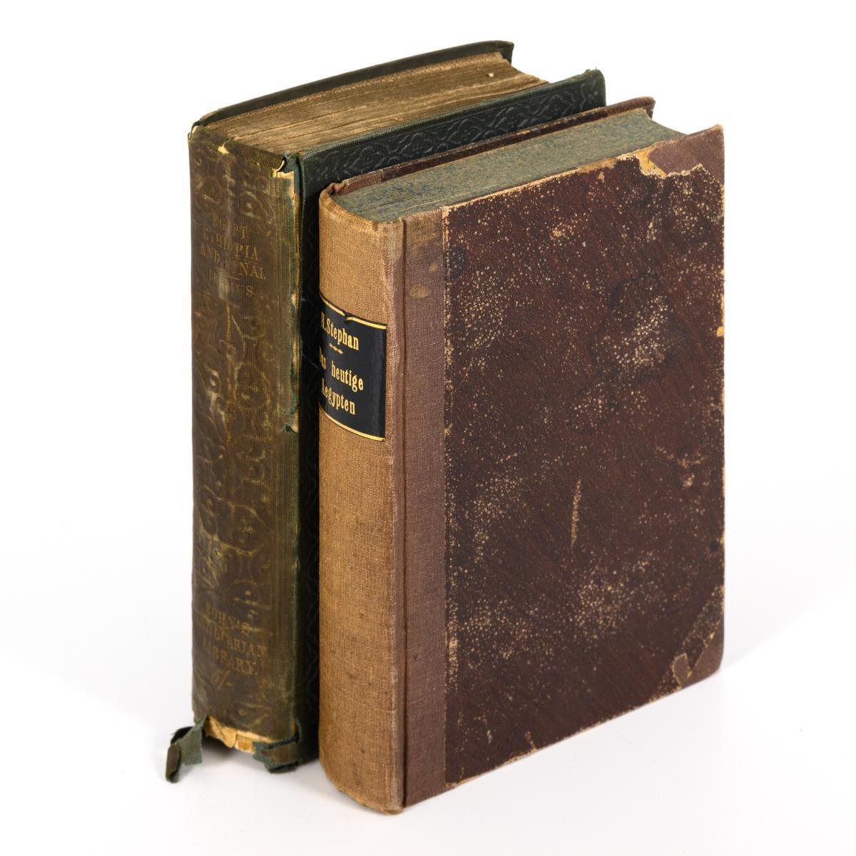 Lepsius, Richard: "Letters from Egypt, Ethiopia, and the peninsula of Sinai. With Extracts from his Chronology of the Egyptians, with Reference to the Exodus of the Israelites". Verlag Henry G. Bohn, London 1853. 578 Seiten, 2 Karten und eine Lithographie. Rücken etwas beschädigt. / Heinrich Stephan: "Das heutige Aegypten, ein Abriss seiner physischen, politischen, wirtschaftlichen und Cultur-Zustände". Leipzig 1872. 528 Seiten und eine Karte.