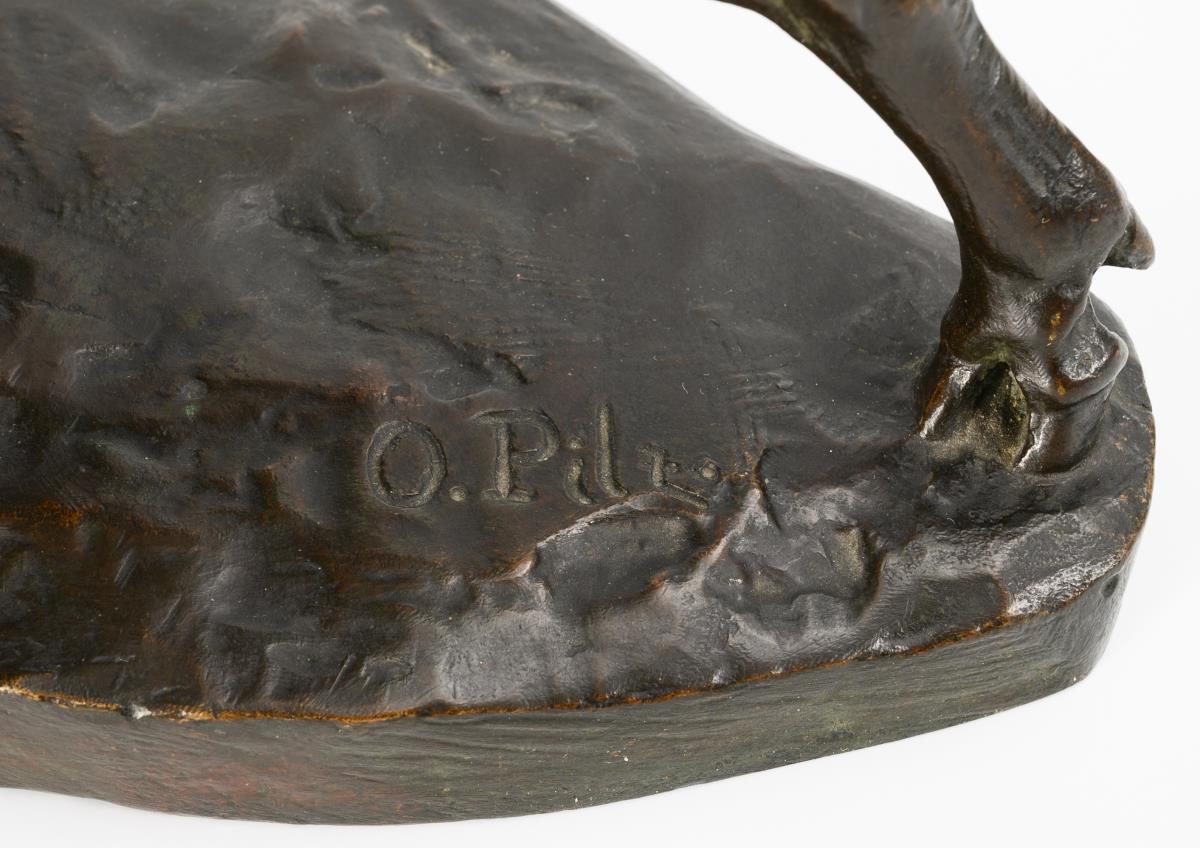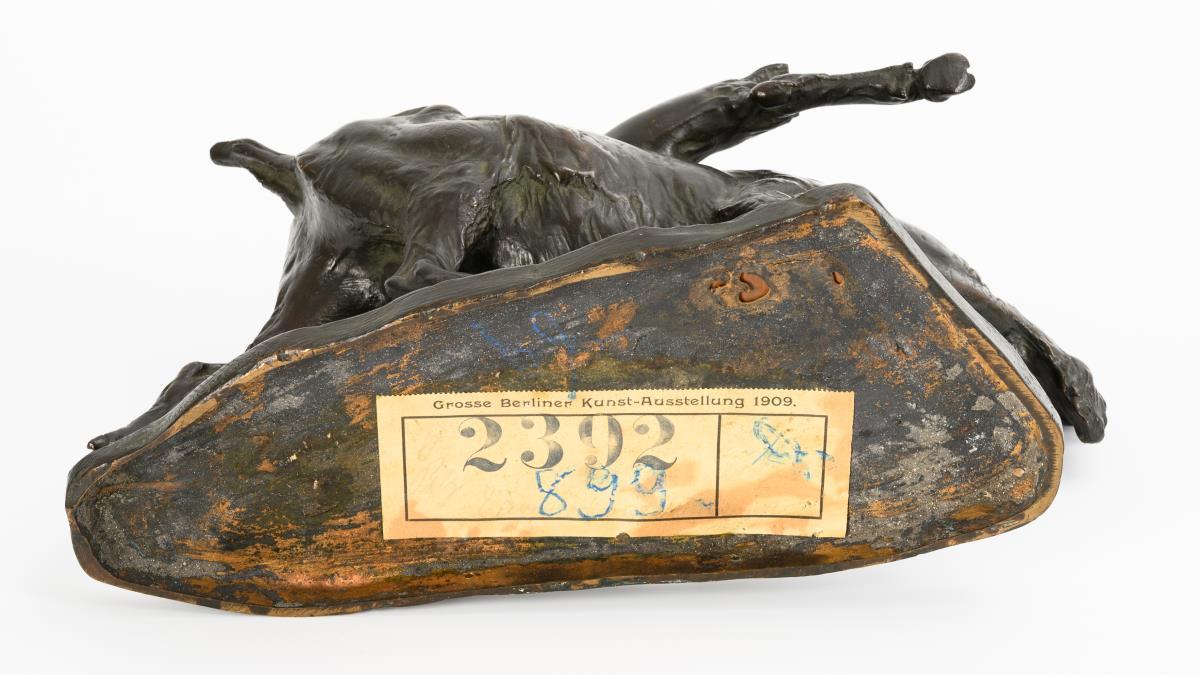 Bronze dunkelbraun patiniert. Bezeichnet, Gießermarke "Guss: A. Milde u. Co Dresden", in der Plinthe Ausstellungs-Etikett "Große Berliner Kunstausstellung 1909" mit Nr. 2392 und 899 sowie Künstlerbezeichnung und Titel. 31,5 x 38,5 x 19 cm. 8,3 kg.