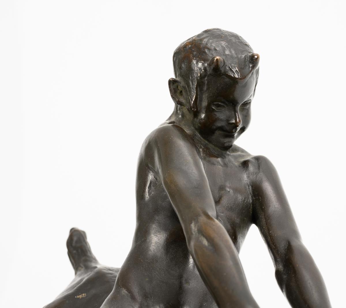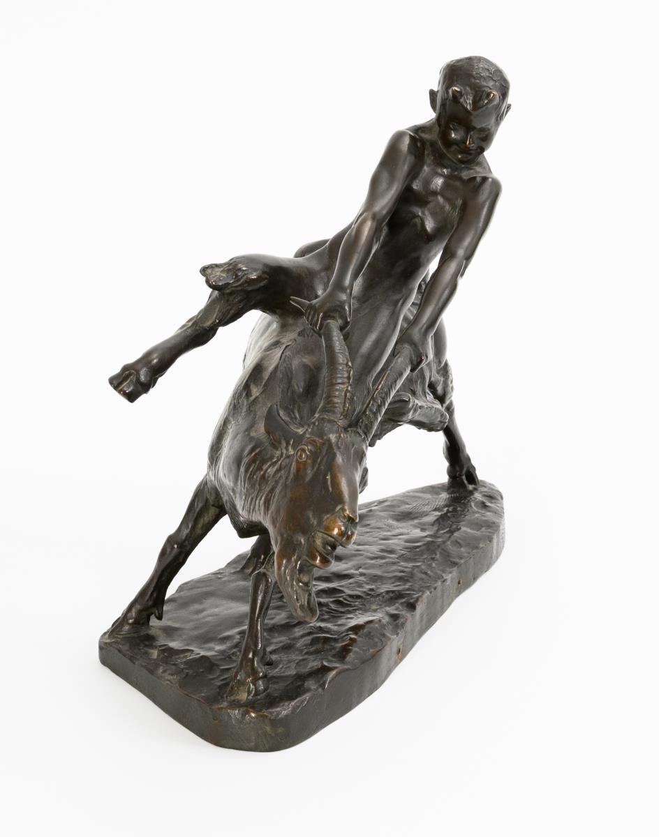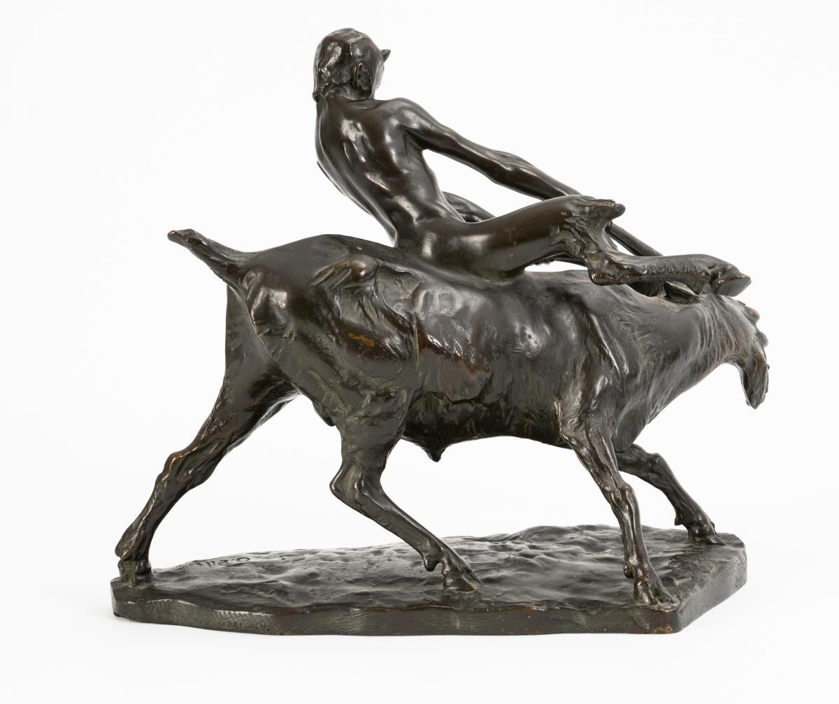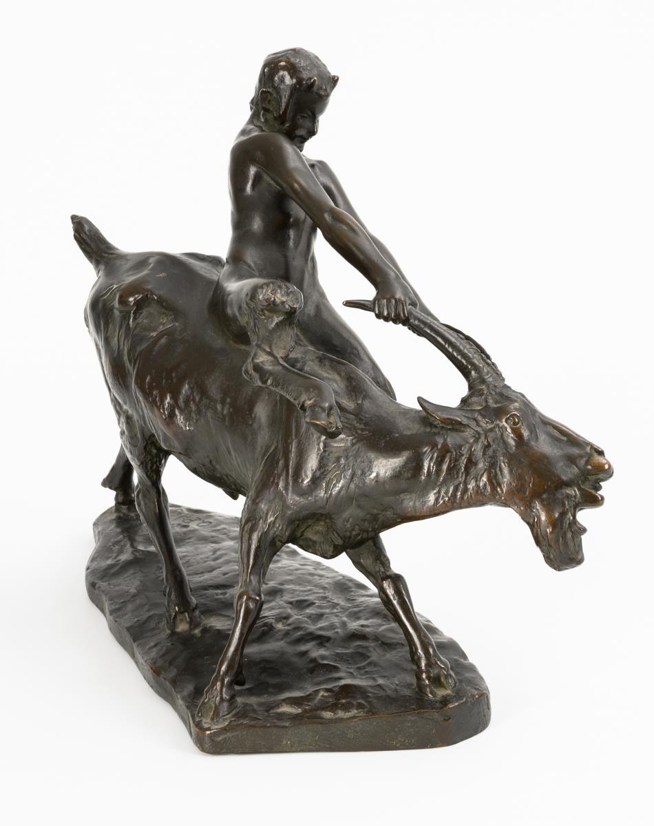Rasant auf der Ziege reitender junger Faun mit Bocksbeinen, wobei er sich an den langen Hörnern festhält. Bohrlöcher und kleinere Kratzer an der Plinthenfront von entfernter Plakette, sonst minimaler Patina-Abrieb.