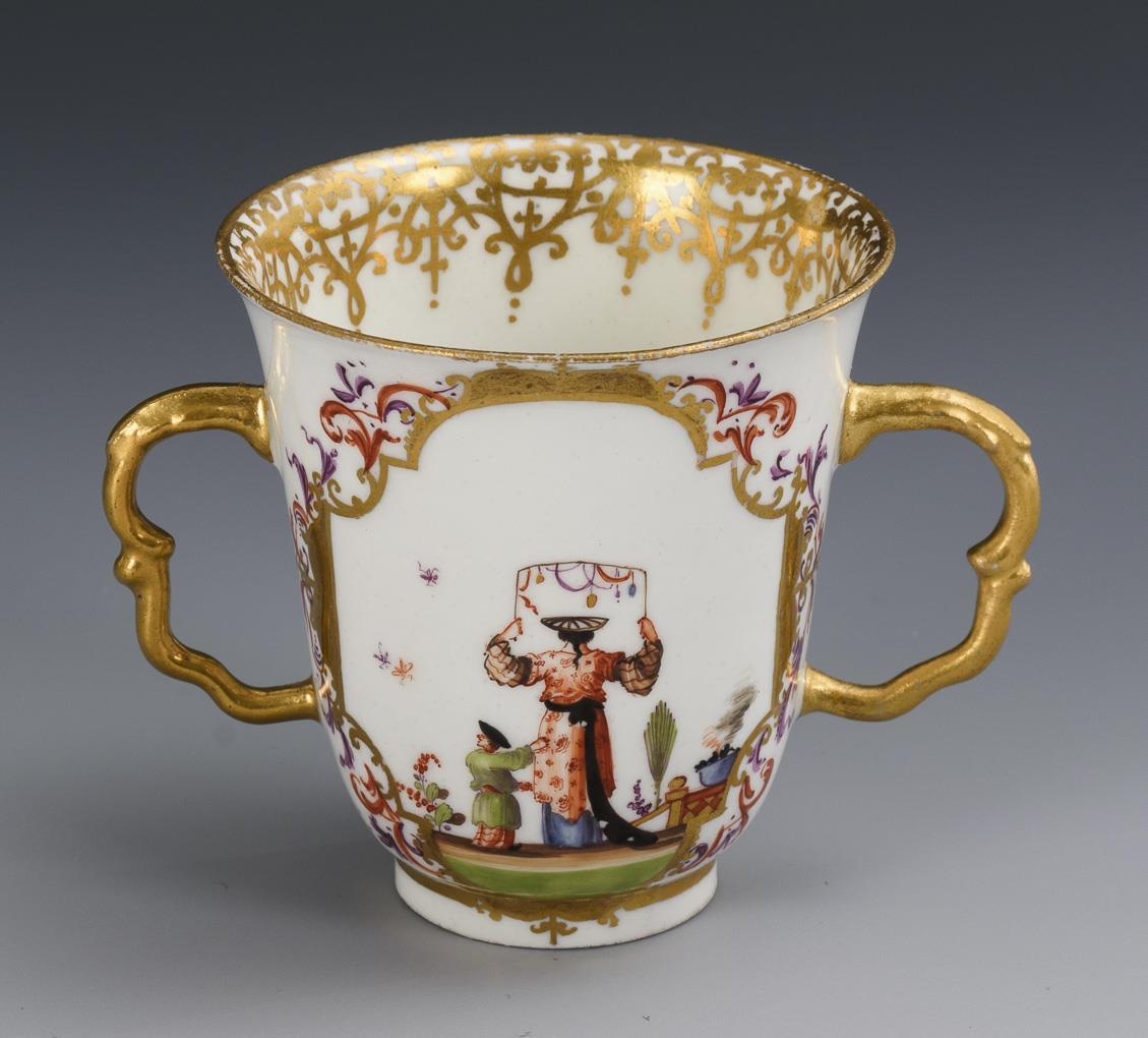 Glockenbecher mit zwei Rocaillehandhaben. Beidseitig eine Kartusche mit der Darstellung eines am Altar opfernden Chinesen bzw. eines Chinesen mit Knaben am Kohlebecken. 1 Randrestaurierung, innen 2 kleine Brandrisse (nicht durchgehend).