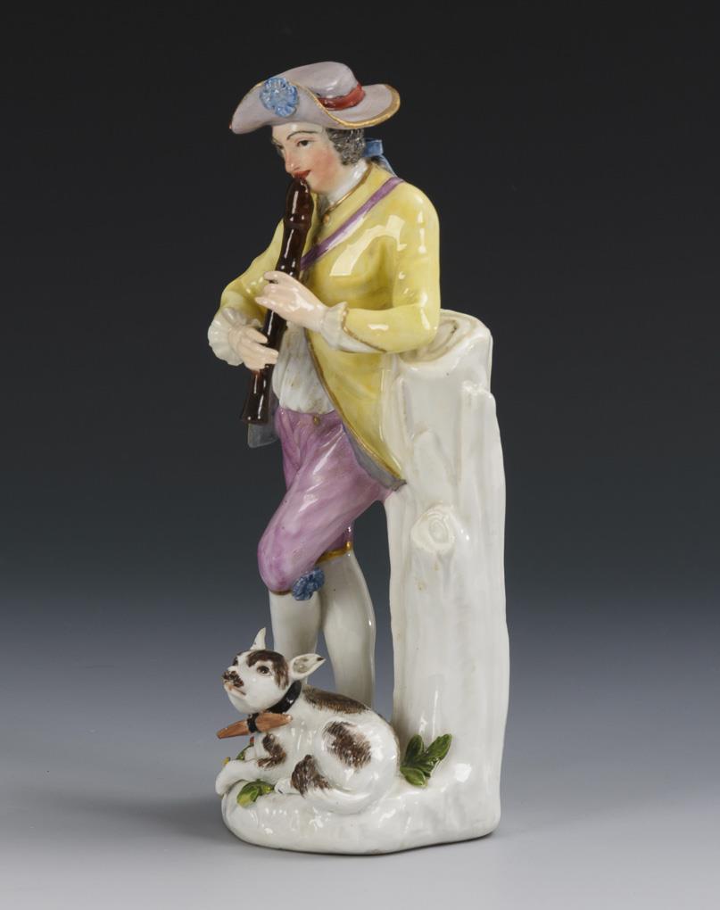 An einem Baumstumpf stehender, eine Flöte spielender Schäfer, zu seinen Füßen ein Hund liegend. Flöte, beide Hände und rechter Arm restauriert.