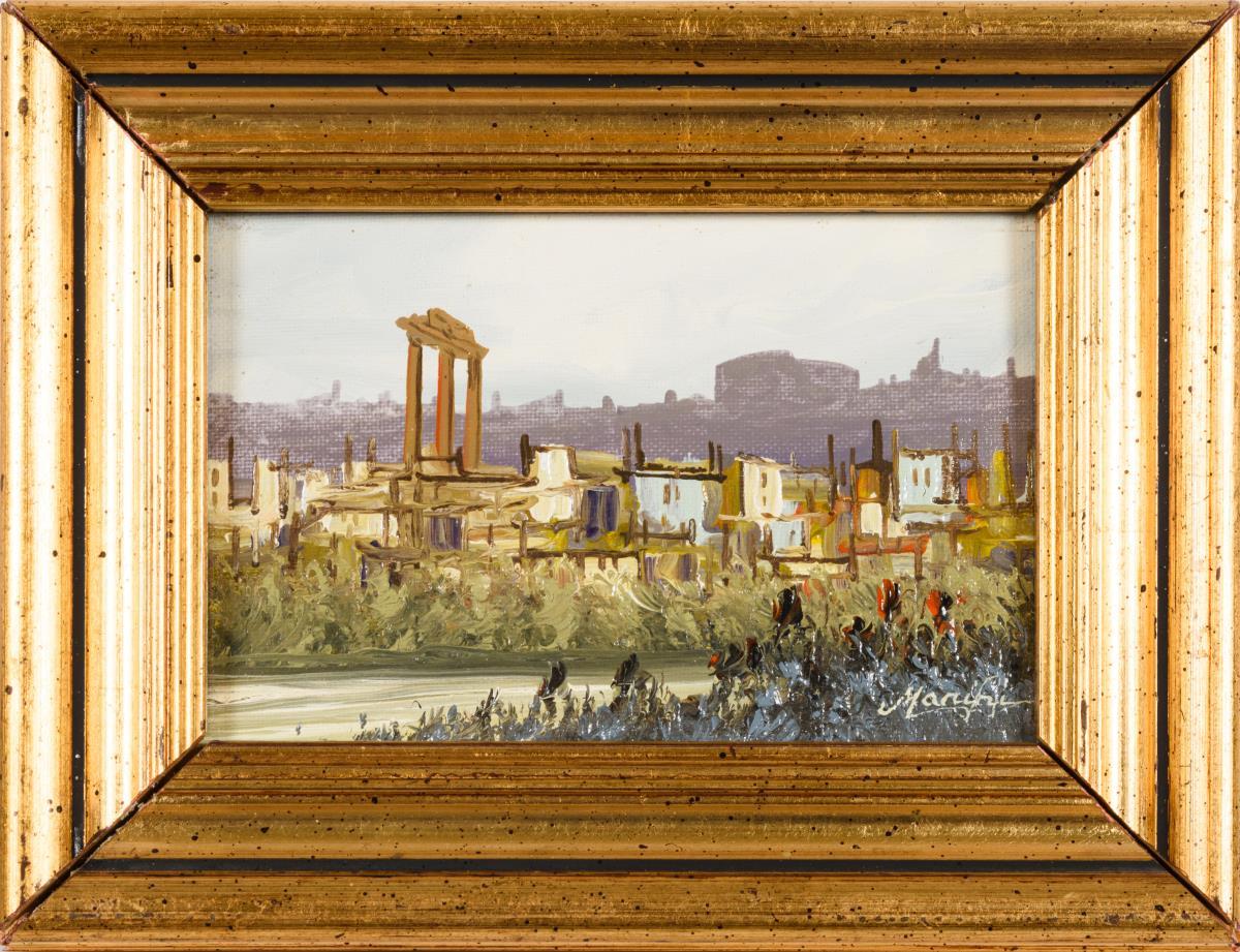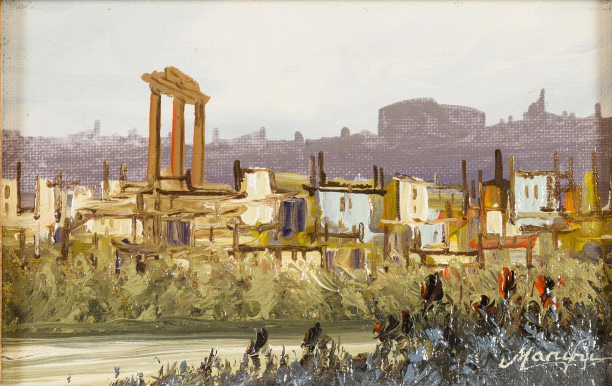 Undeutlich signiert: Südliche Stadt mit Tempelruine