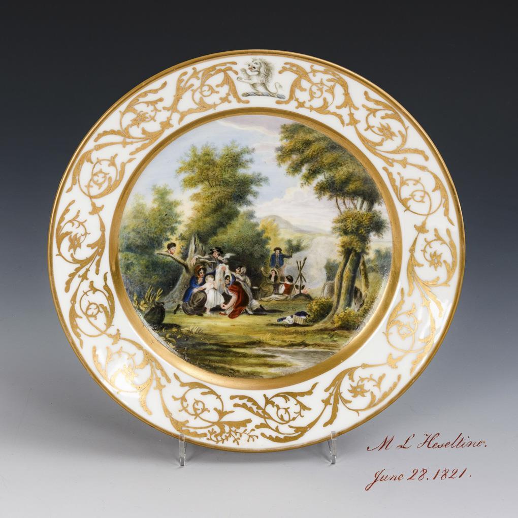 Im Spiegel die Darstellung einer vielfigurigen Szene auf einer Waldlandschaft, auf der Fahne goldenes Rankenwerk und ein weißer Löwe, unterseitig bezeichnet M L Heseltine. June 28. 1821.".