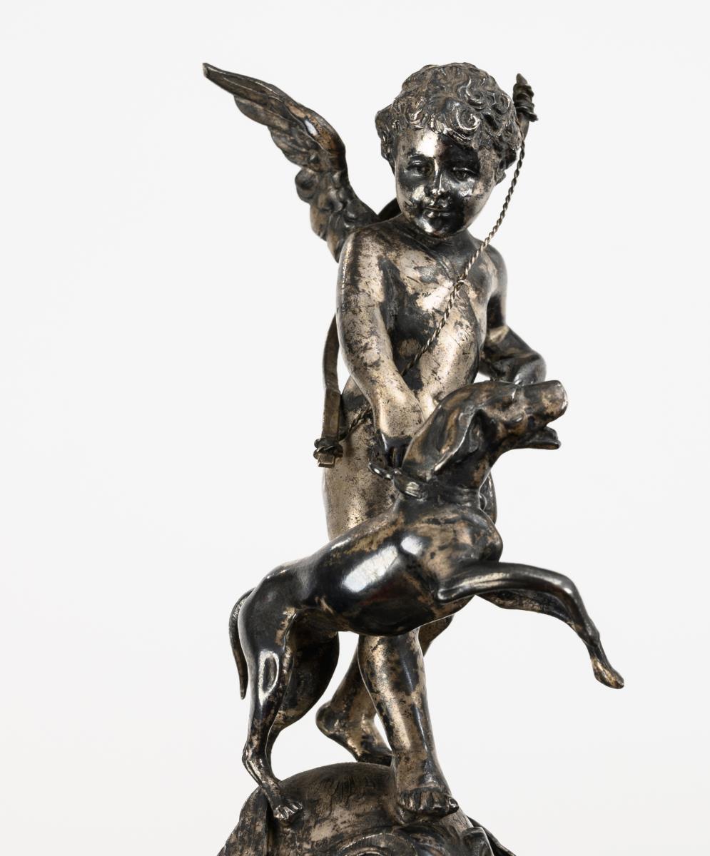Auf barock geformtem Sockel mit erlegtem Federwild über der Kugel schreitender Putto mit geschultertem Bogen und Hund an der Leine. Geschwärzt, Chips am Marmor.