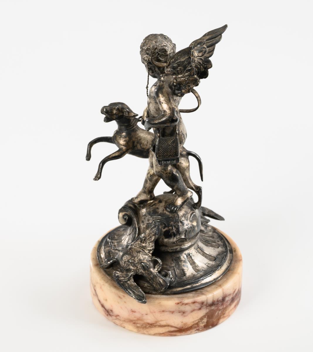 Metall versilbert, helle Marmor-Plinthe. Ende 19. Jh. H 13 / 15 cm.