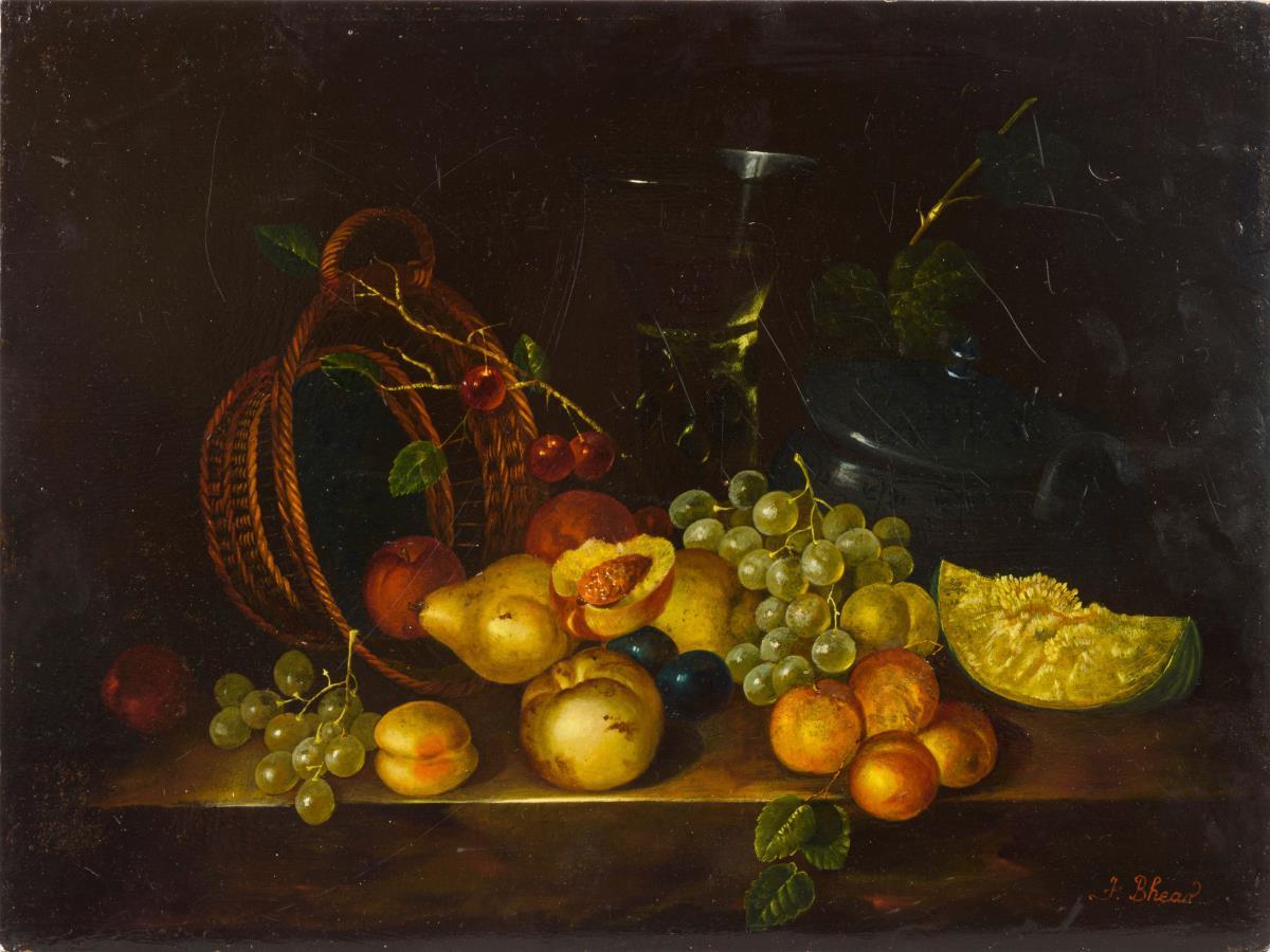In der Manier der Altmeister gemaltes Früchtestillleben mit Melone, Trauben, Pfirsich, Birne, Apfel und einem Korb sowie einer Dose und einem Weinglas. Leichte Altersspuren.