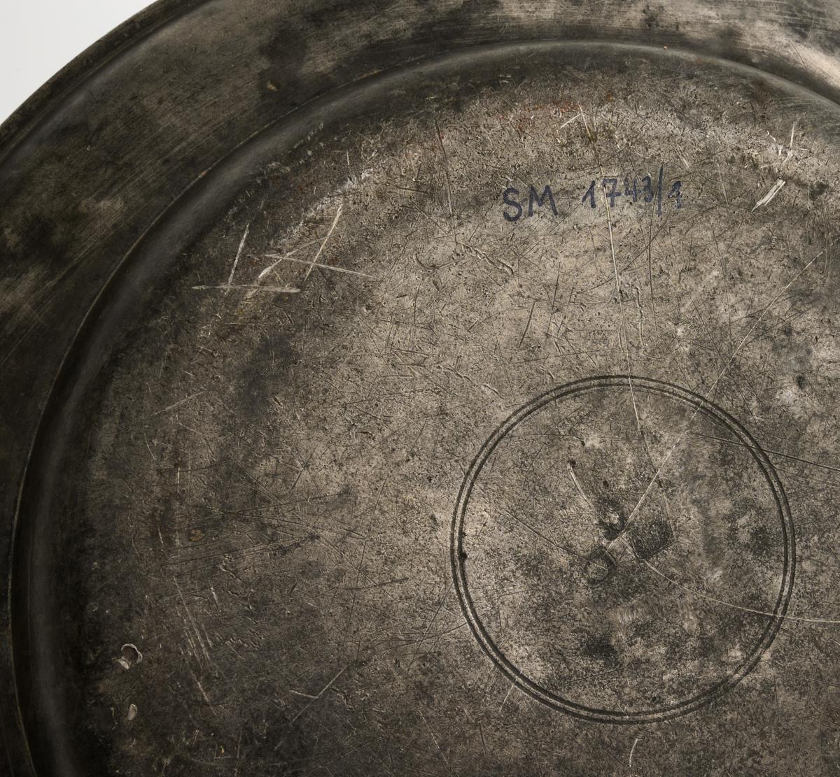 Spätbarocke Zinnschale und -Teller mit Gravur.