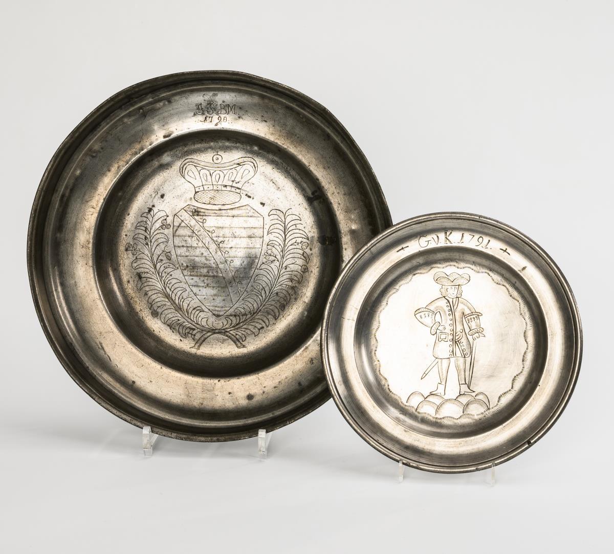 3-fach undeutlich gepunzte große Schale mit geflächeltem Wappen von Sachsen auf dem Spiegel; auf der Fahne verändertes Monogramm mit Datum "1798". 3-fach gepunzter Teller mit graviertem Edelmann auf dem Spiegel; auf der Fahne "G.v.K 1791". Alters-/Gebrauchsspuren.