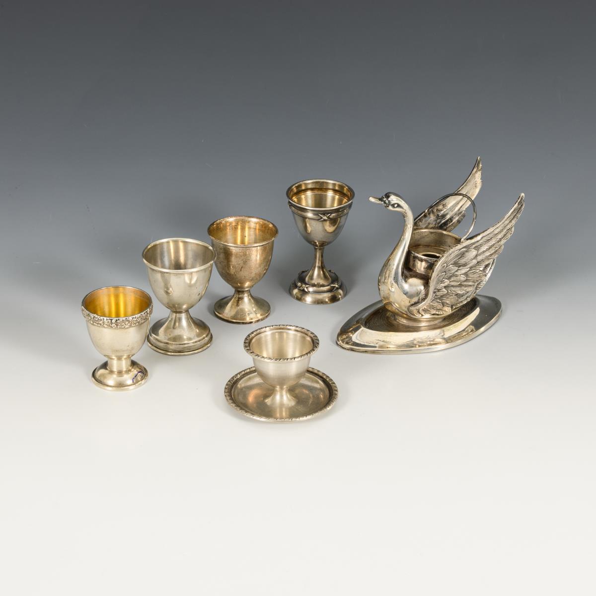 Silbernes Schwanengefäß und 5 Eierbecher.