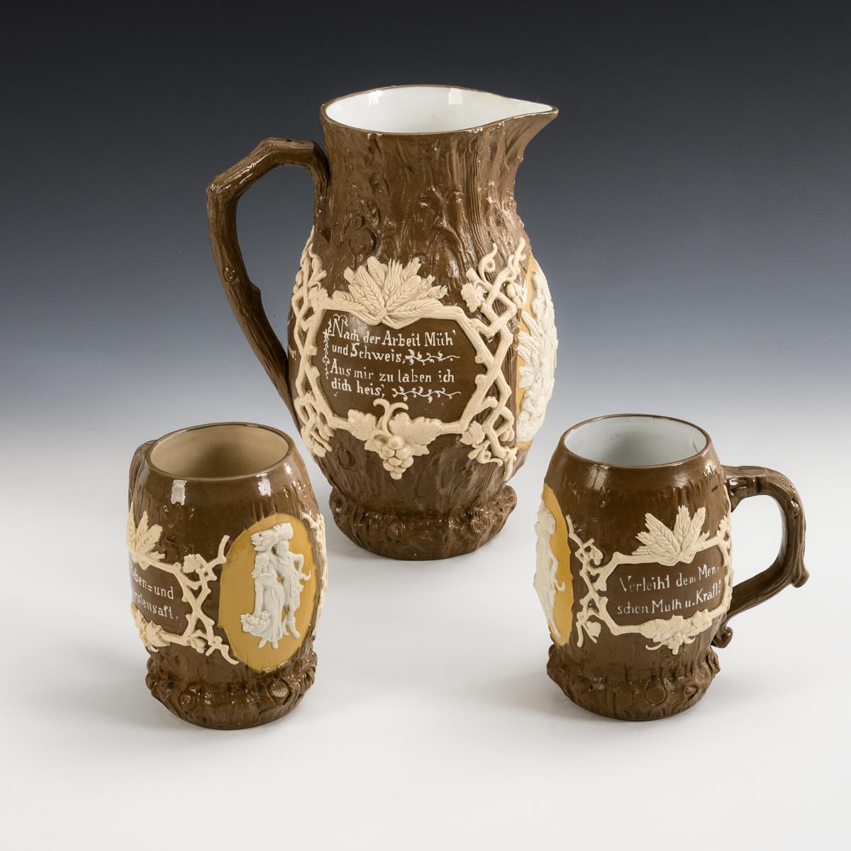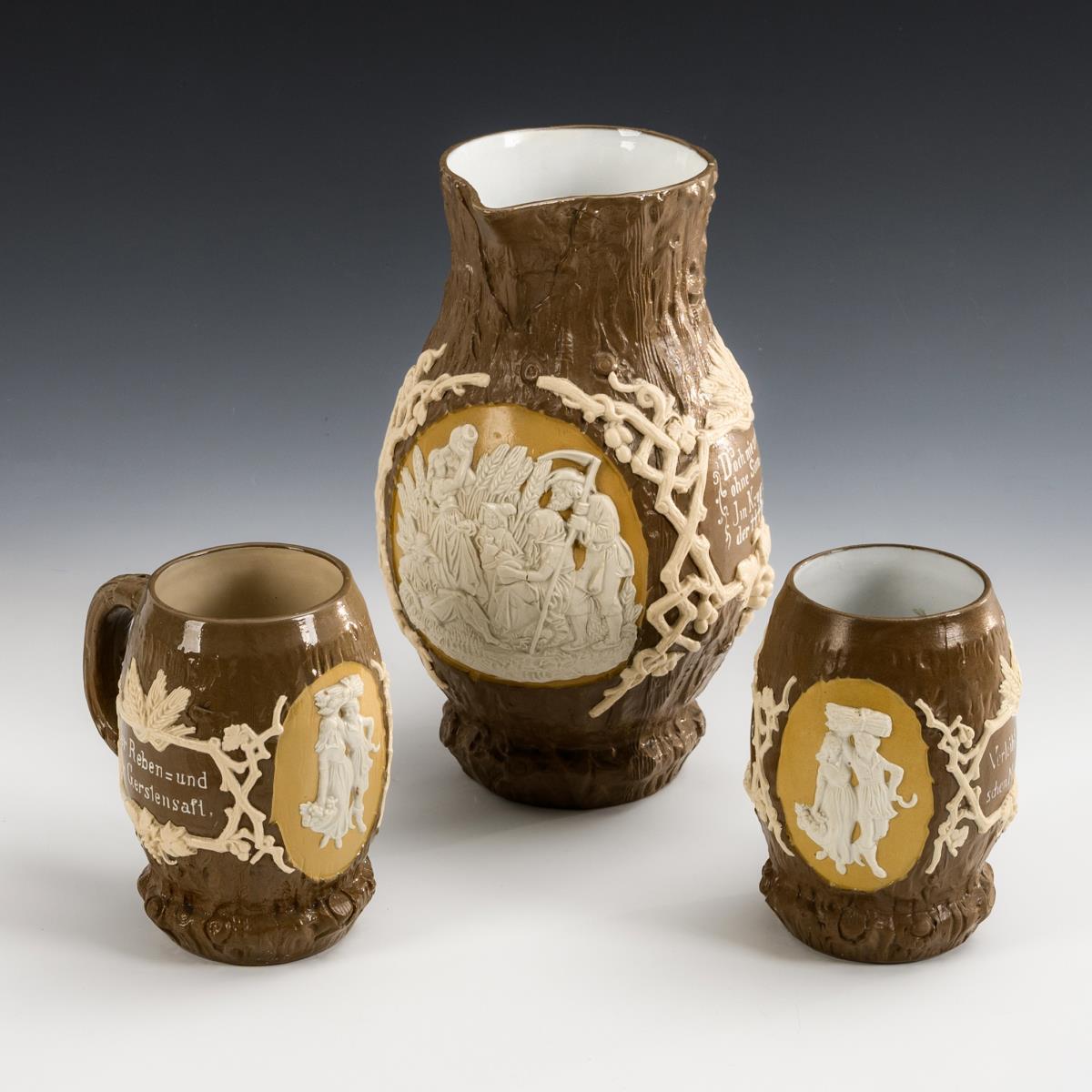 Gründerzeit-Kanne und 2 Krüge mit Asthenkeln, Wandung in Baumstruktur mit aufgelegtem Floraldekor und Trinksprüchen, schauseitig eine Bauernfamilie im Kornfeld und ein junges Bauernpaar.