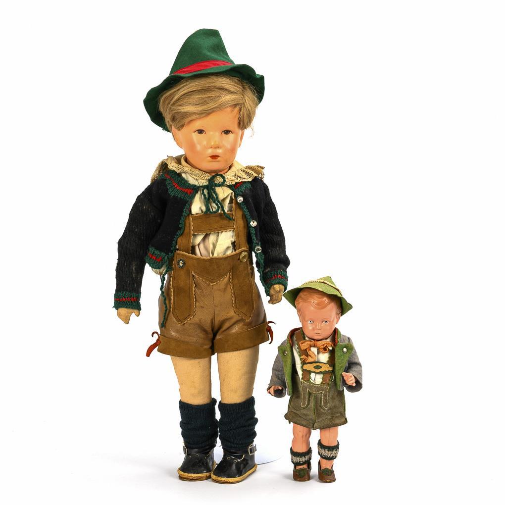 Beide Puppen als Tiroler alt bekleidet. "Deutsches Kind" (Typ VIII) mit Kurbelkopf, 1 Hinterkopfnaht, blonder Echthaarperücke, schlankem Stoffkörper. Mehrere Retuschen im Gesicht, Farbabrieb im Nacken, L 50 cm. / Celluloid-Puppe mit festem Kopf, schablonierten blauen Augen, modellierten Haaren und 5-teiligem Stehpuppenkörper, L 25 cm.