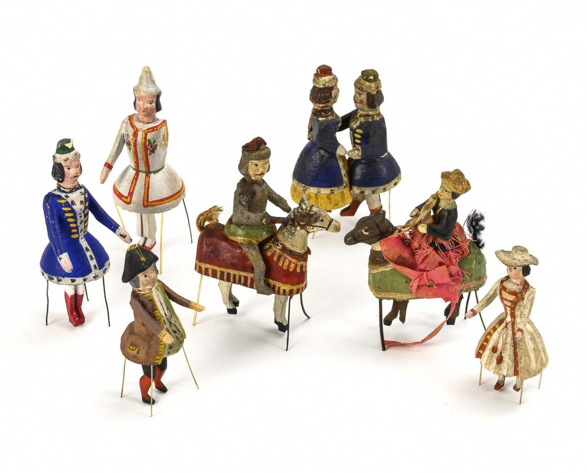 Verschiedene Figuren, darunter Ritter und Dame auf Pferd, Tanzpaar und 4 Einzelfiguren. In hellgrüner, ergänzter Schachtel (2,5 x 15,5 x 13,5 cm). Wenige kleine Defekte und Fehlteile.