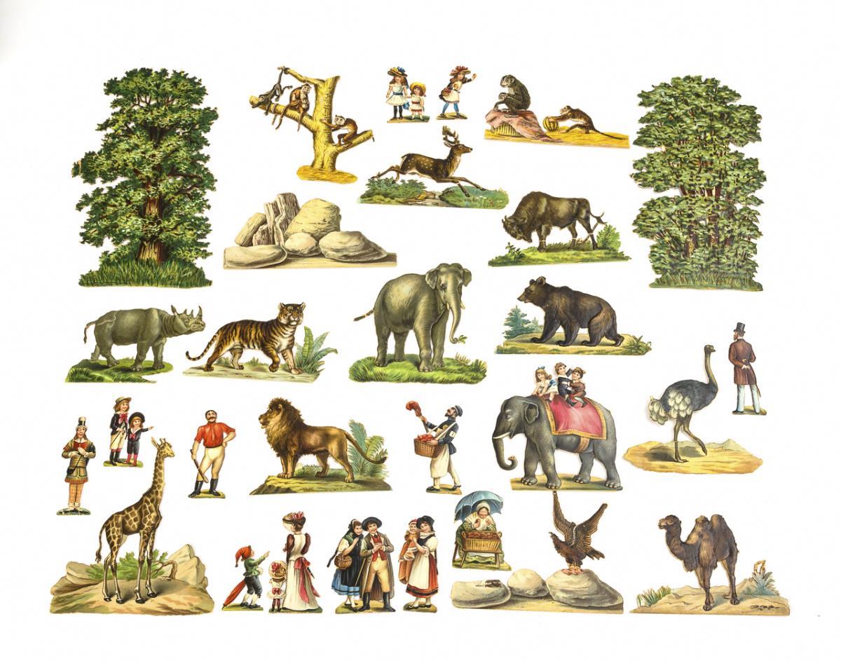 Tiere, Bäume und Figuren aus geprägter Pappe, mit Metall-Aufstellern. Dazu Anleitung in englischer Sprache. Figuren teilweise hinterklebt, ergänzter Grundplan als Farbkopie anbei.