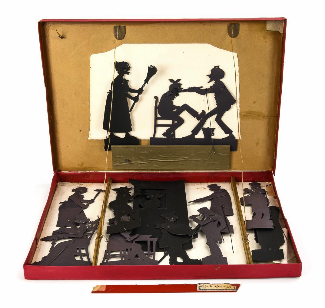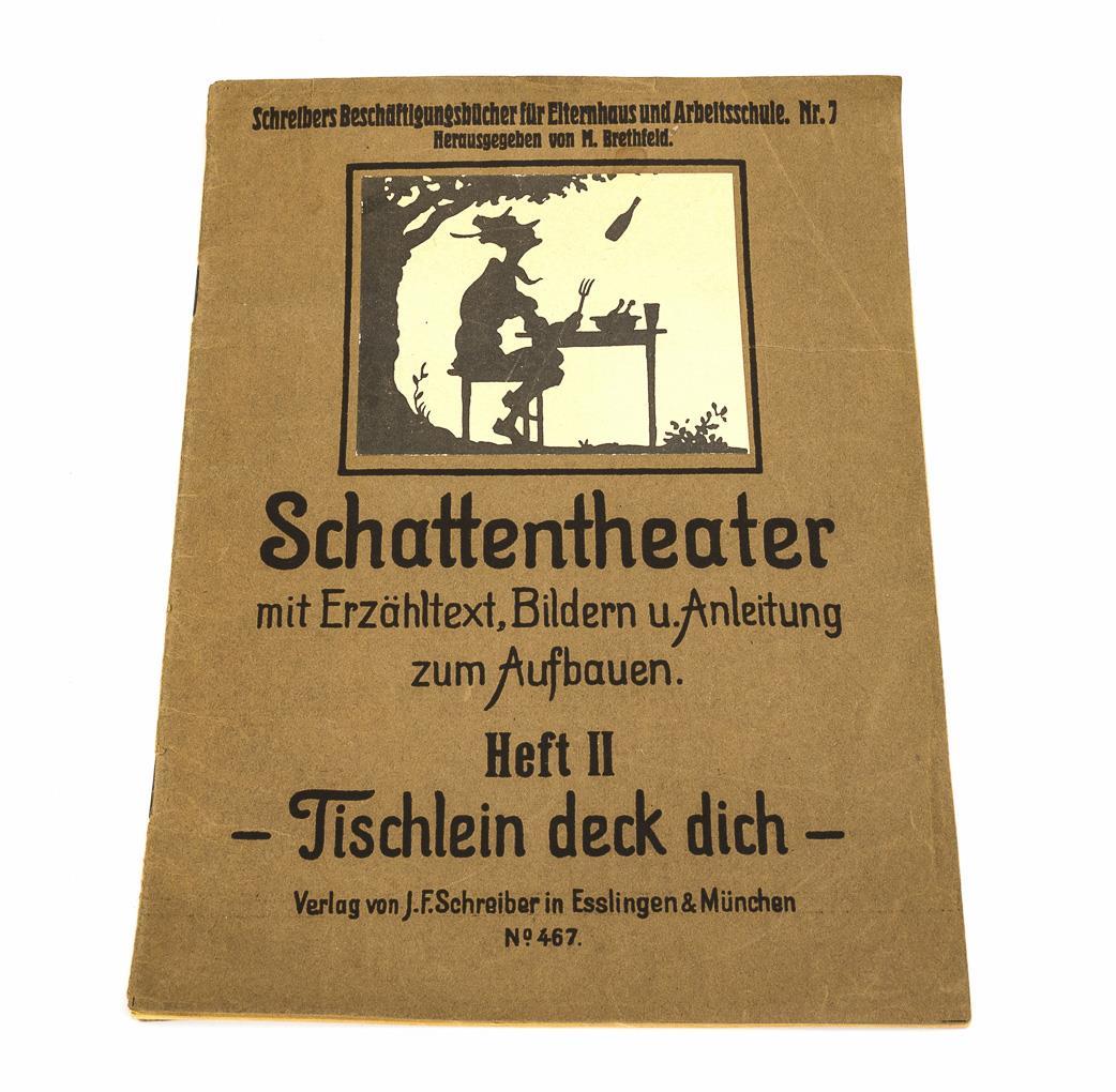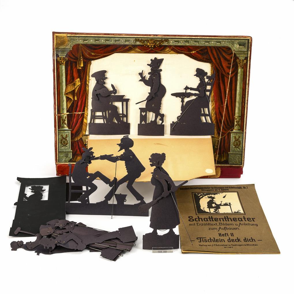Aufklappbarer Kasten als Bühne und ca. 12 Figuren mit Führungsdraht. Dazu Anleitungsheft "Schreibers Beschäftigungsbücher für Elternhaus und Arbeitsschule, Heft II, Tischlein deck dich". Altersspuren, Defekte, Schachtel restauriert.