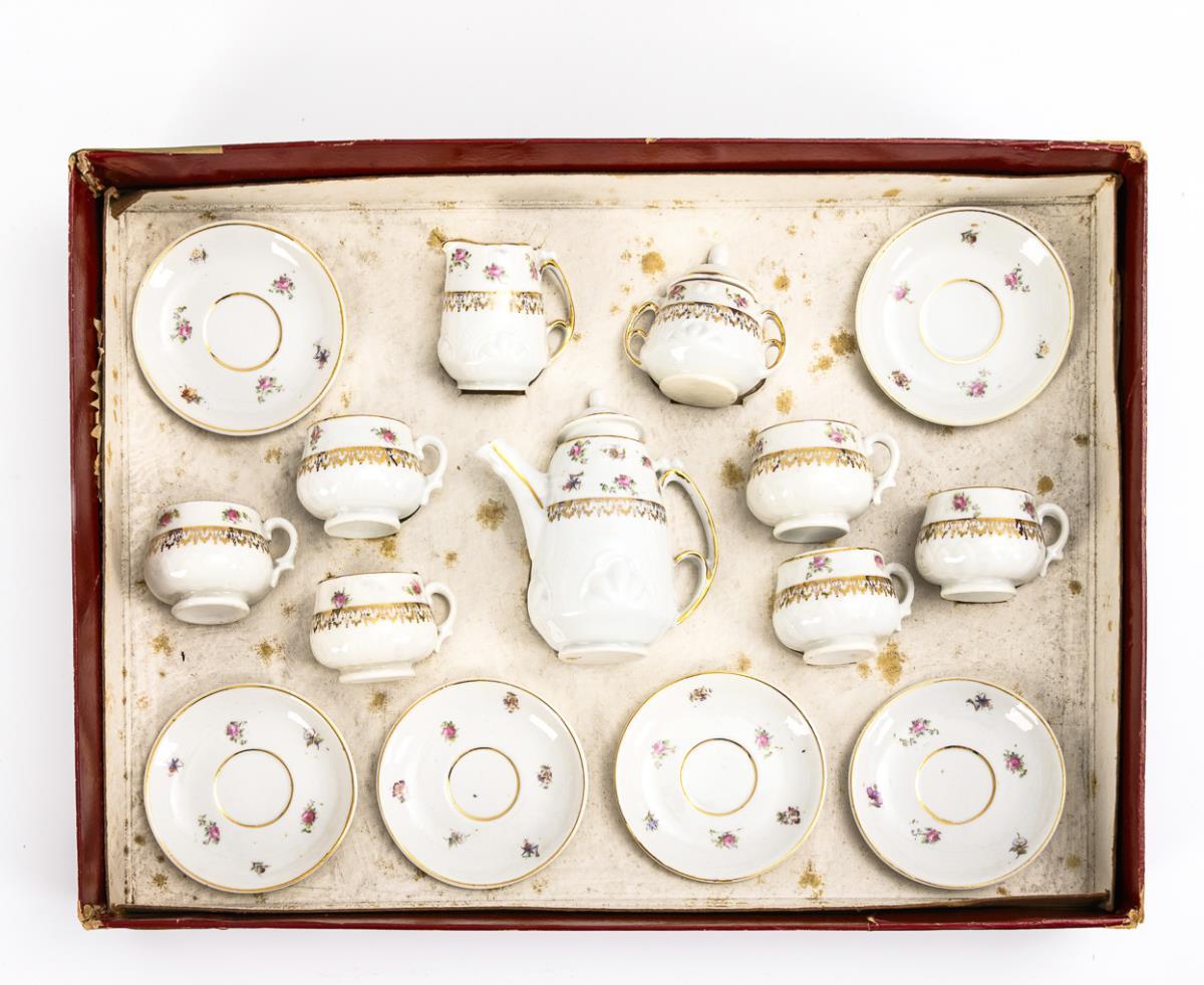 Kaffeeservice für 6 Puppen oder Kinder: Kaffeekanne (H 12 cm), Zuckerdose, Sahnekännchen, 6 Tassen (H 4,5 cm) und 6 Untertassen. In dunkelrotem Pappkarton. 1 UT mit unterseitigem Brandriss, Gold partiell berieben, Kasten mit Klebeband repariert.