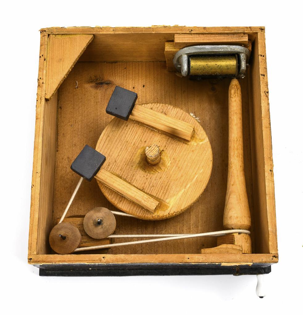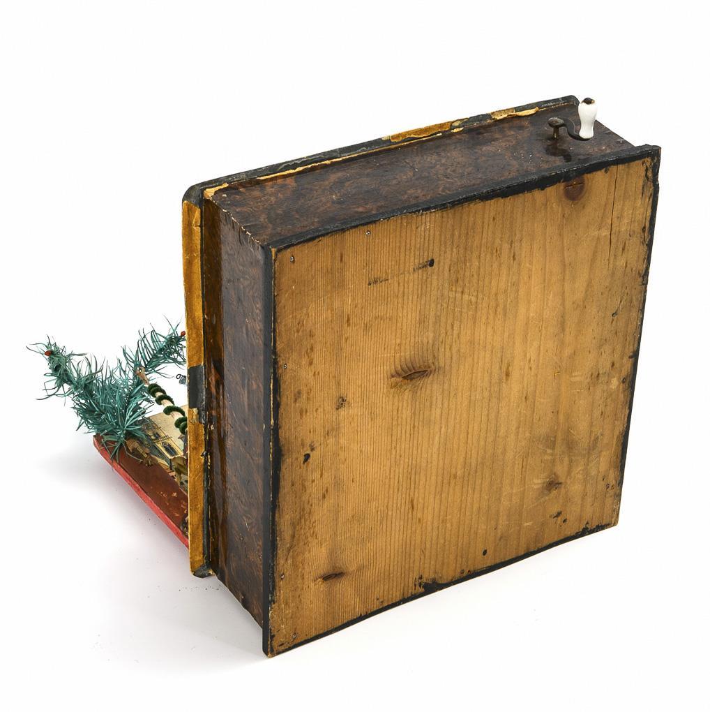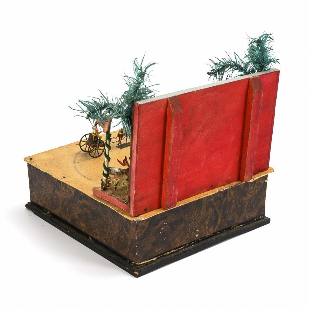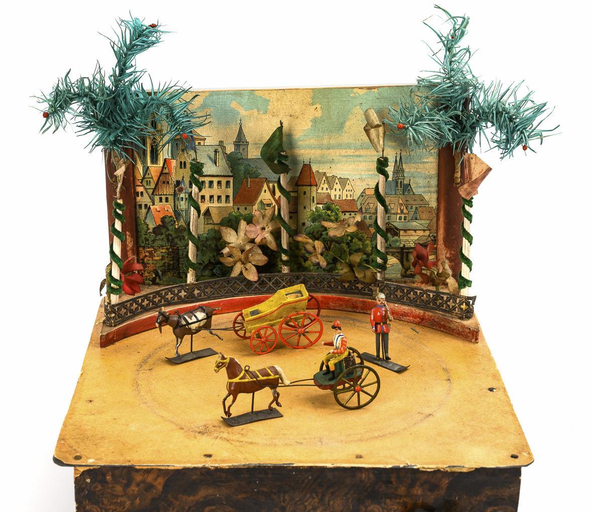Papierkaschiertes Holzkästchen mit Stadtszene, davor Freifläche mit 3 Figuren (Sulky, Ziegenwagen und Soldat). Innen Spieluhr und Drehteller mit Magneten, durch Kurbeln wandern die magnetisch geführten Figuren. Restaurierungsbedürftig, Riemen innen ergänzt, Spieluhr intakt.
