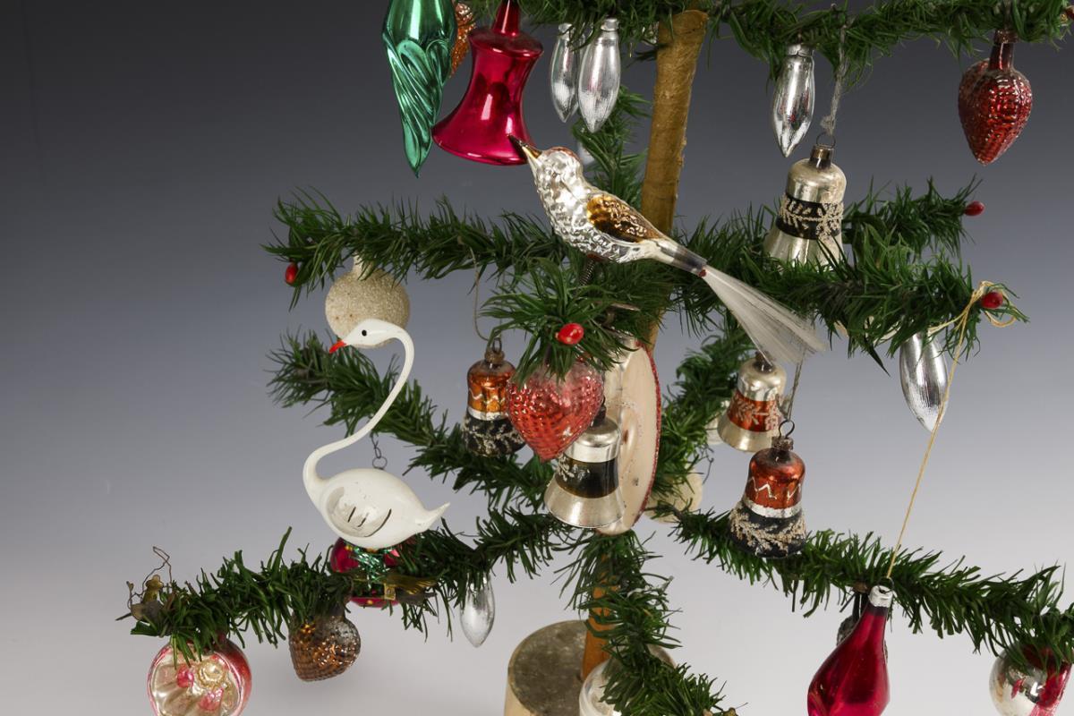 Reich geschmückter Weihnachtsbaum mit Glasbehang in Form von Kugeln, Glocken, Zapfen und Herzen. Teils kleine Defekte.