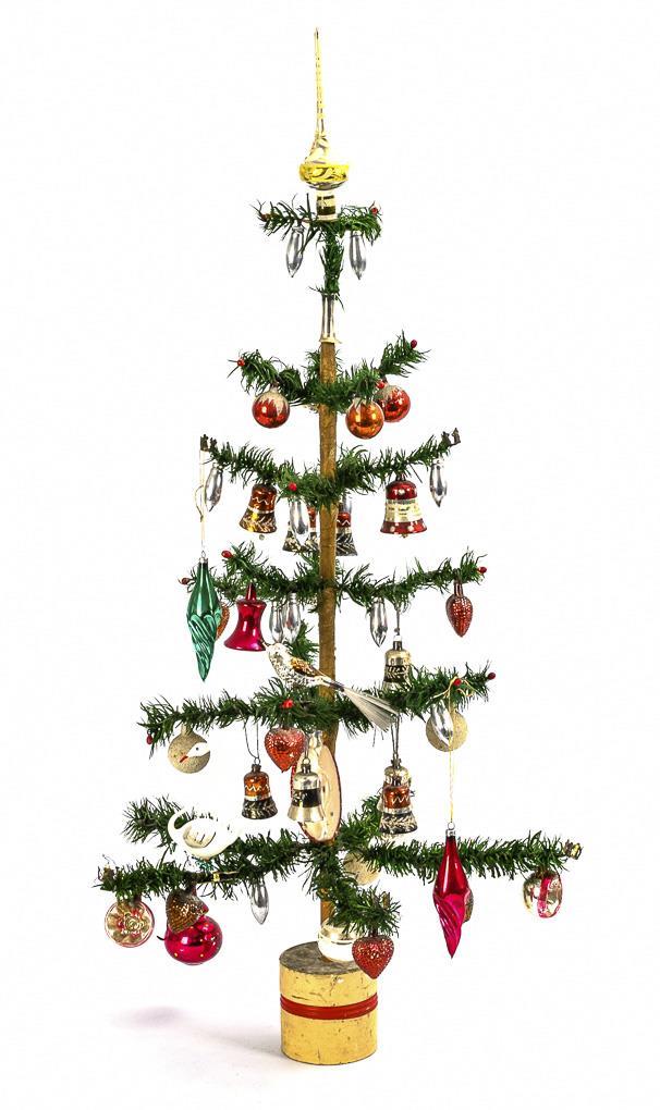 Reich geschmückter Weihnachtsbaum mit Glasbehang in Form von Kugeln, Glocken, Zapfen und Herzen. Teils kleine Defekte.
