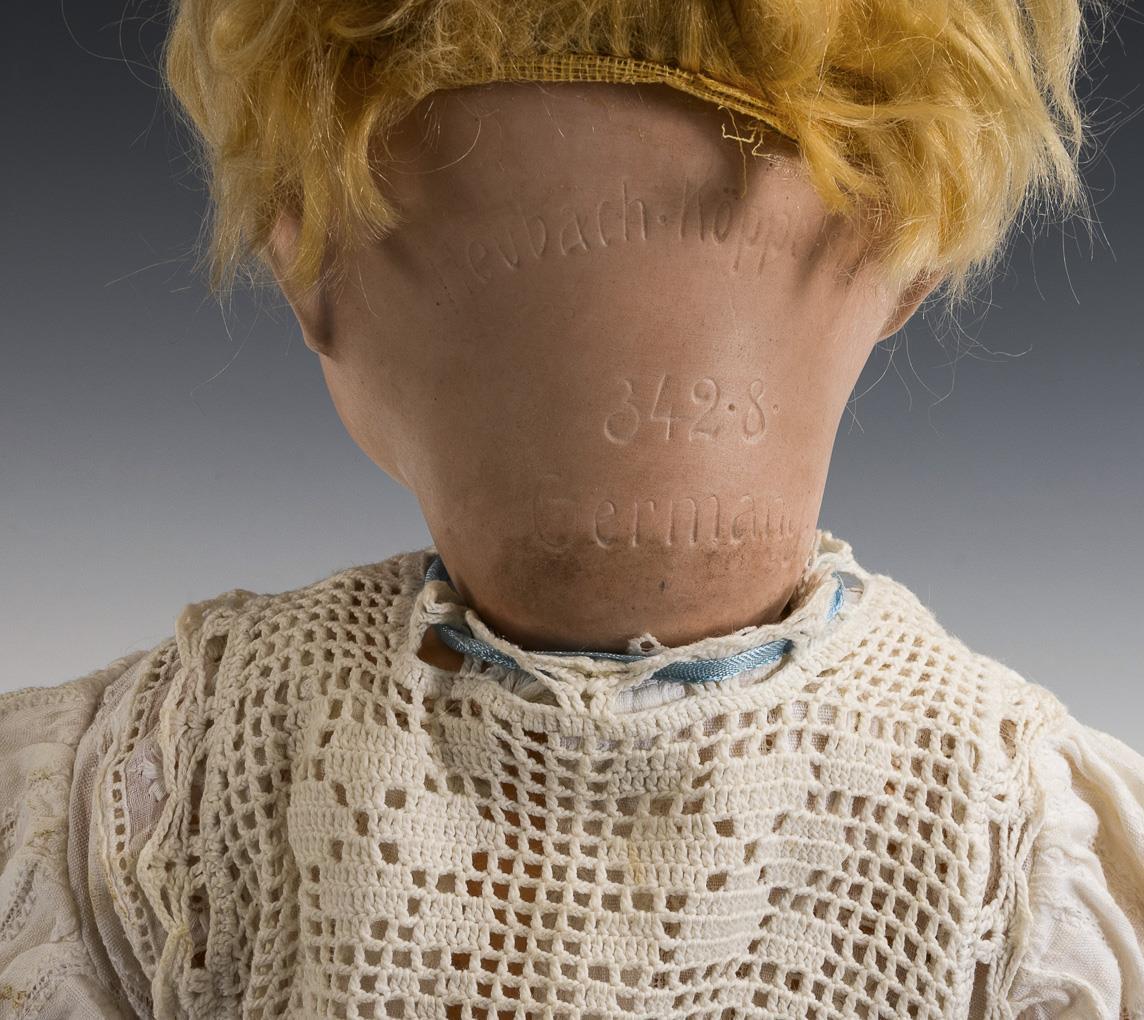Kurbelkopf, braune Schlaf-/Schelmenaugen, originale Perücke. 5-teiliger Stehbabykörper mit Stimme. Weißes Kleid, Häkelmantel, lachsfarbene Wachstuchschuhe. Kopf nicht durchleuchtet: keine Risse sichtbar, kleiner Chip an der Halskurbel. Körper mit kleinen Farbdefekten, 1 Finger fehlt.