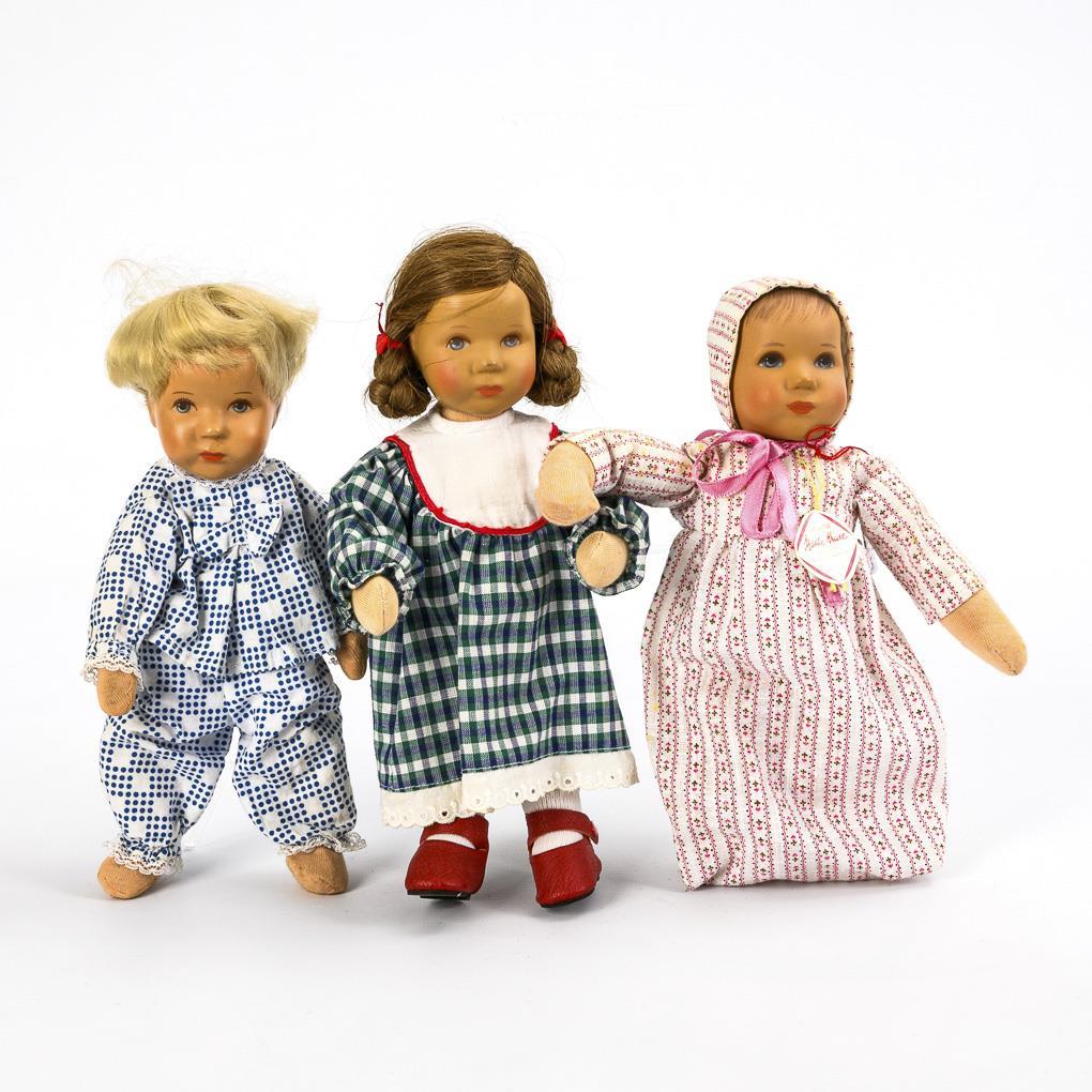 Jeweils mit Kunststoffkopf, gemalten blauen Augen, Stoffkörper mit Drahtskelett und originaler Bekleidung. Schaumstoff geschrumpft bei Junge im Schlafanzug.