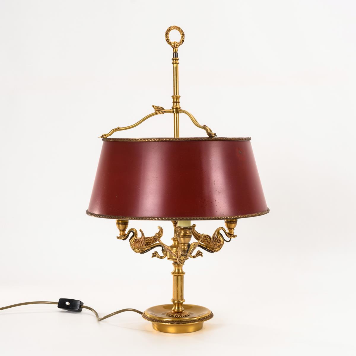 Tischlampe mit figürlichen Schwanen-Armen und Schraubfassungen in Kunststoff-Kerzenhülsen sowie Tragering. Höhenverstellbarer Schirm aus Eisenblech; außen rot, innen weiß lackiert. Wenige Alters-/Gebrauchsspuren.
