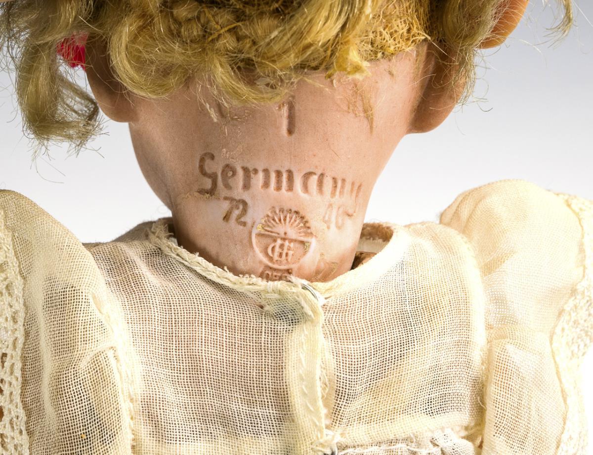 Kurbelkopf, blaue Schlafaugen, geschlossener Mund, blonde Mohairperücke. 5-teiliger Sitzbabykörper. Weißes Kleidchen. Kopf durchleuchtet: ohne Defekte, Körper komplett übermalt.