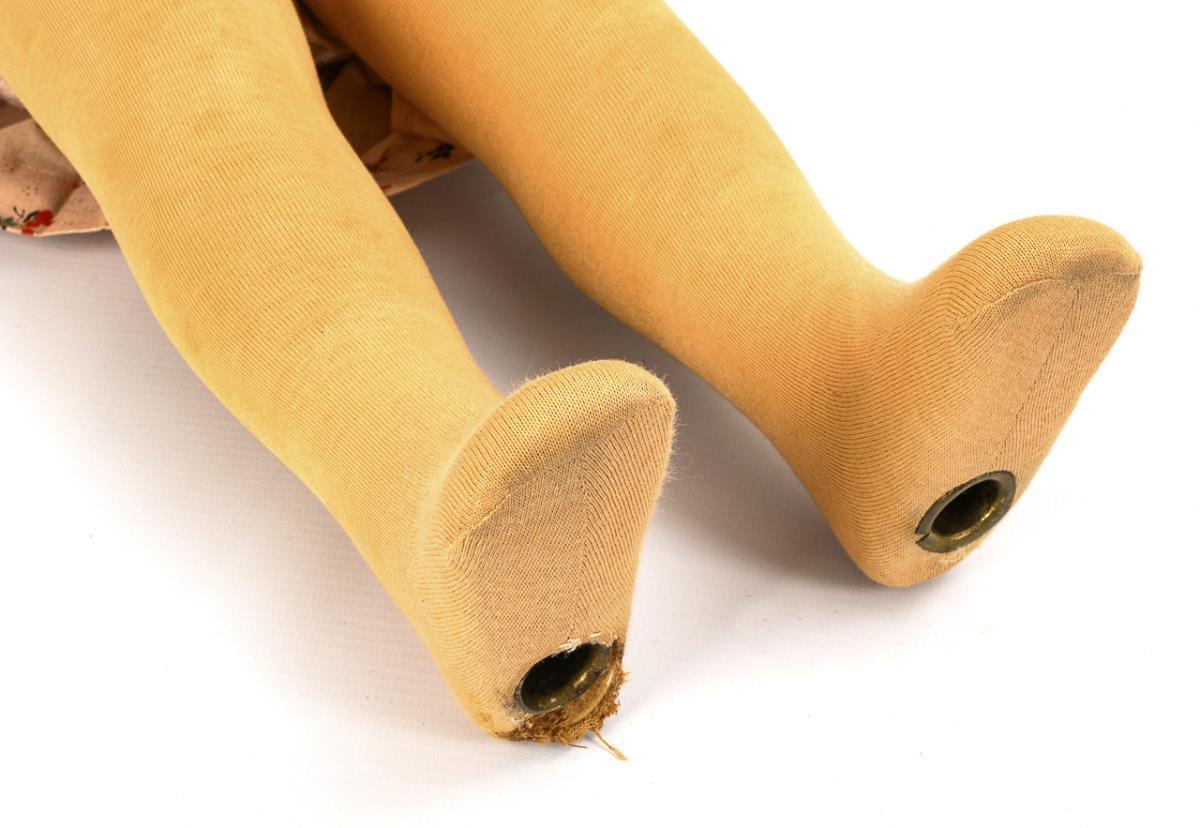 Größe 10. Abnehmbarer Magnesit-Kurbelkopf, braune Augen, geknöpfte blonde Echthaarperücke. Stehender Trikot-Körper mit festen Beinen und Löchern in den Fußsohlen. Rosa Kleid mit Blümchenmuster, weiße Kindersandalen. Kopf rissig, Stoff an Fingern und rechtem Fuß mit Defekten.