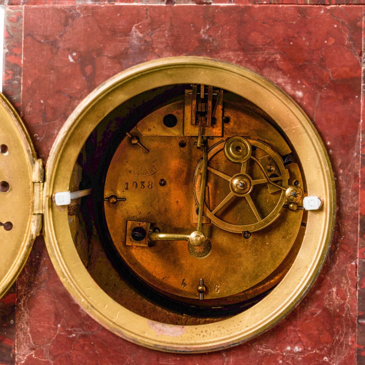 Gestuftes Gehäuse mit Vasenbekrönung und floralen Applikationen. Gehwerk läuft, Schlagwerk defekt. Uhrwerkhalterung provisorisch, Stundenzeiger locker, Ergänzungen.