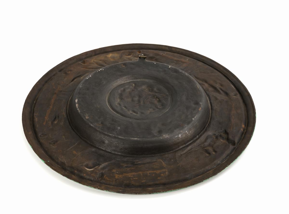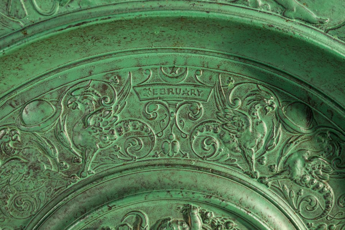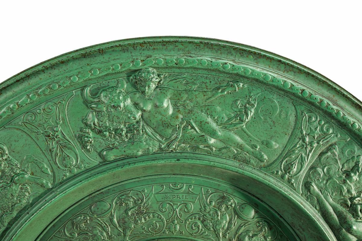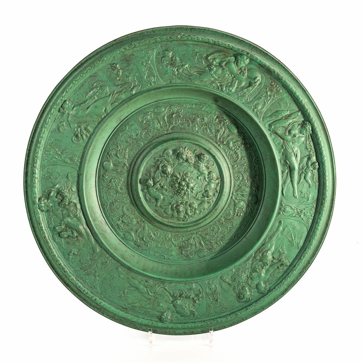 Überaus reich reliefierter Teller mit Puttenreigen im Zentrum, umringt vom Greifen-Ranke mit den Monatsschildern Januar bis Juni. Auf der Fahne weibliche Allegorien für die 6 Monate/Tierkreiszeichen. Leicht berieben und verschmutzt.