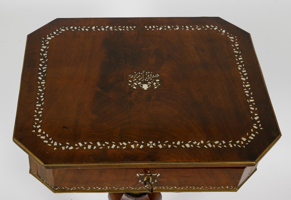 Eleganter rechteckiger Nähtisch auf kannelierter Mittelstütze mit oktogonalem Sockel; fein verziert mit Perlmuttintarsien und Messingauflagen; innen ohne Gefache; unterseitig Etikett "Schlossmuseum Altenburg, Inv.-Nr. SM 1505". Restaurierungsbedürftig.