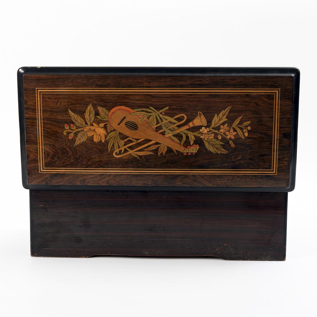 Palisander furniert, teils gefärbte Marketerie, Furnier-Imitat, Eisen, Messing und Glas, Werk mit 8 Liedern, steingelagertes Windrad. 17,5 x 53 x 24 cm, Zungenkamm 20 cm, Walze 23 cm. 10,9 kg.