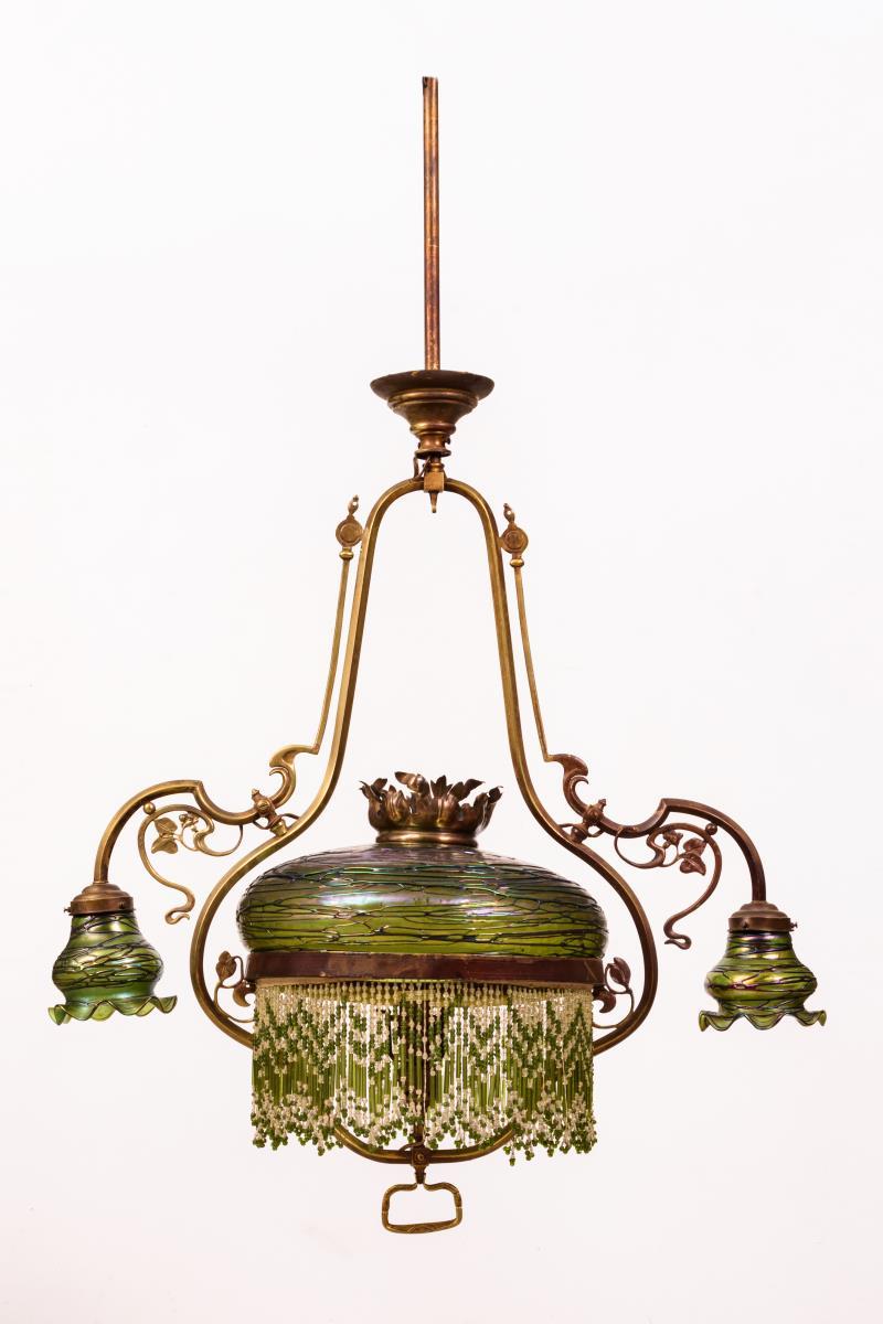 Grün matt-irisierendes Glas, mit violettem Glasfadennetz umsponnen, Messing. Gesamtlänge ca. 120 cm, B ca. 80 cm.