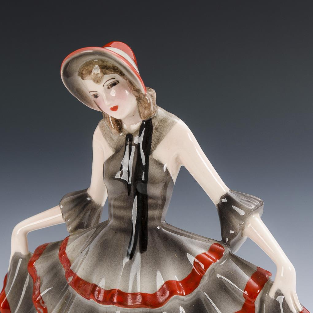 Dame mit Schutenhut und Rüschenkleid in Grau und Rot, auf Rundsockel. Rote Borten des Kleides teils retuschiert.