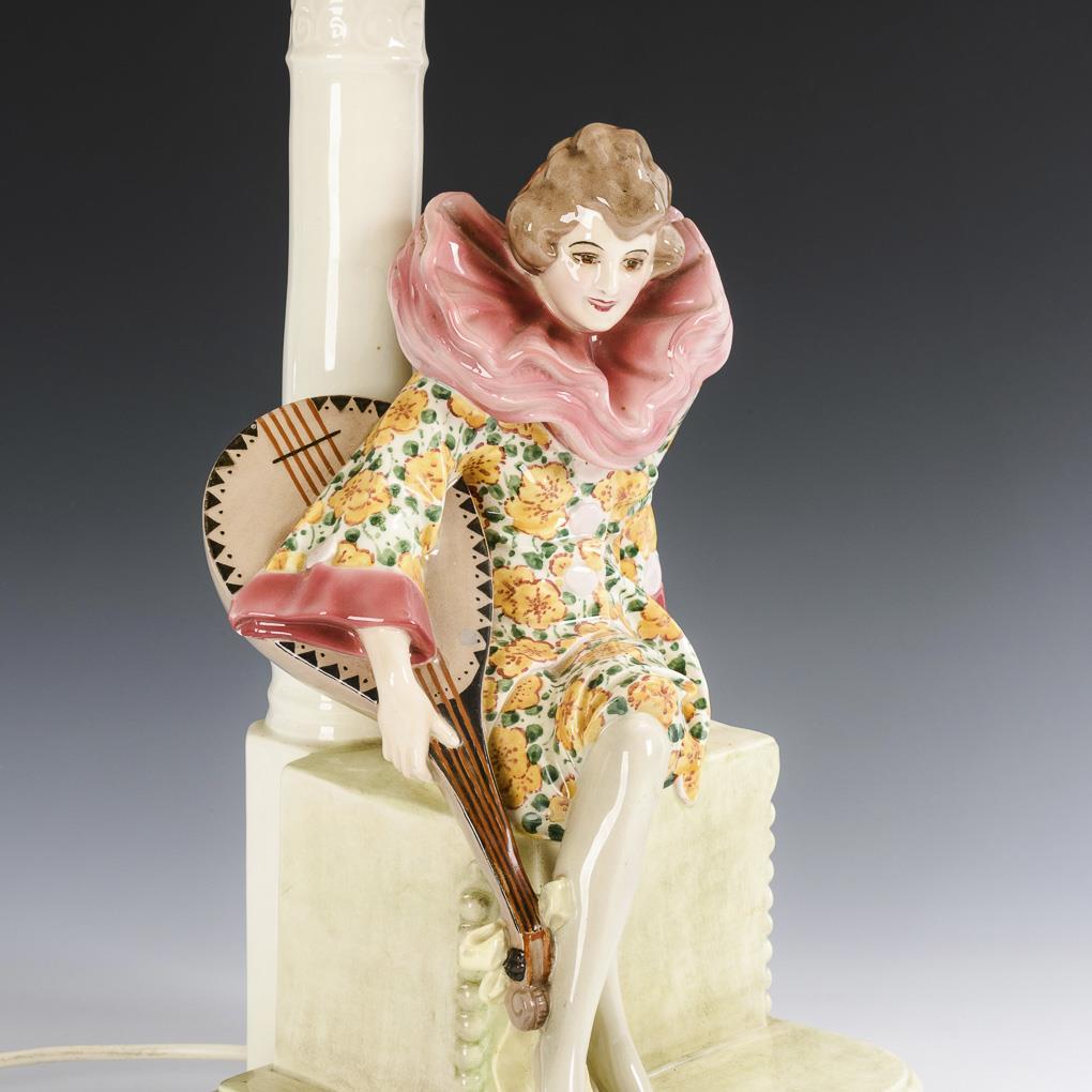 Tischlampe mit Keramik-Figur: Sitzende Pierrette mit Laute. Wiener Manufaktur Friedrich Goldscheider.