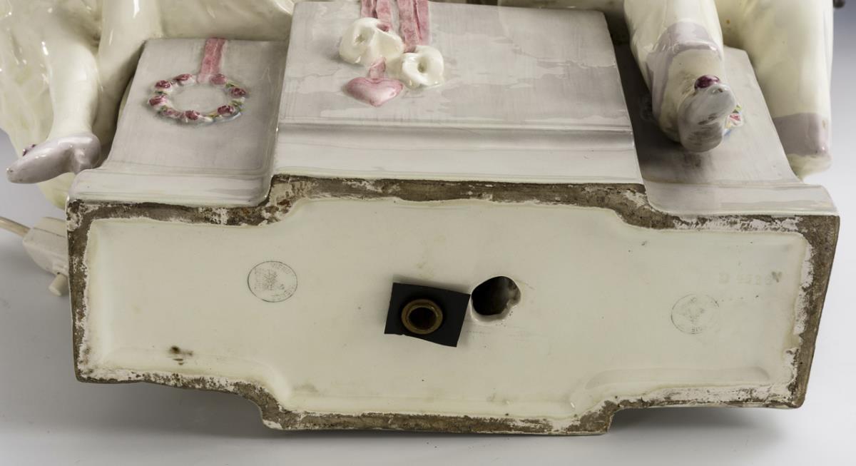 Brunnenartiger Lampenfuß mit blumenverziertem Säulenschaft und einem Laute spielenden Pierrot und fröhlicher Colombine. Ovaler Schirm mit roséfarbenem Stoffbezug und Plisseefaltenschlag. Doppelte Lampenfassung. Elektrifiziert, Funktion nicht geprüft. Laute und linke Hand des Pierrot restauriert, Montierung instabil/revisionsbedürftig.