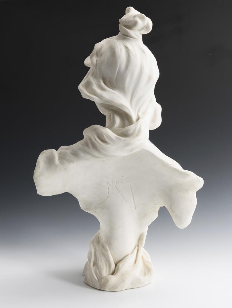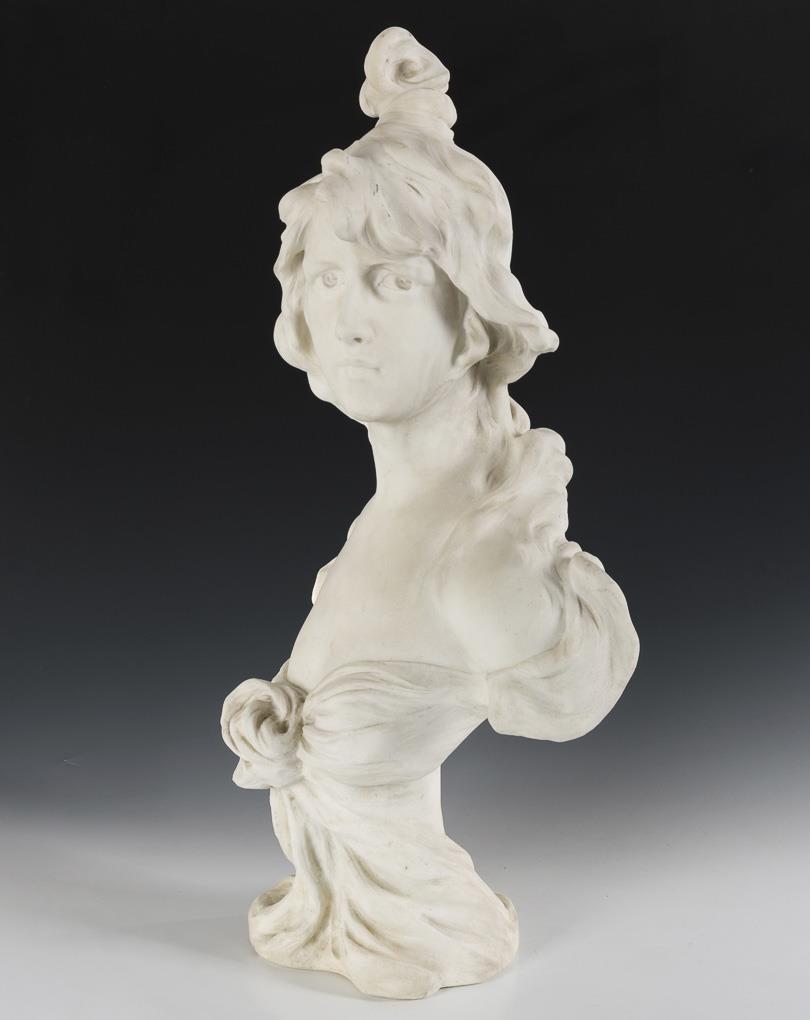 Auf dem verdrehten Tuch des Kleides als Sockel gleichsam herauswachsende Büste der Schönheit mit Blick zur Seite. Etwas verschmutzt.