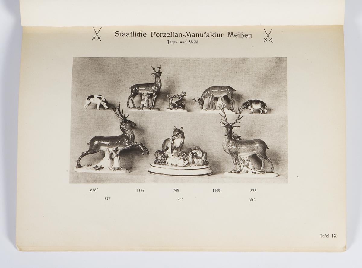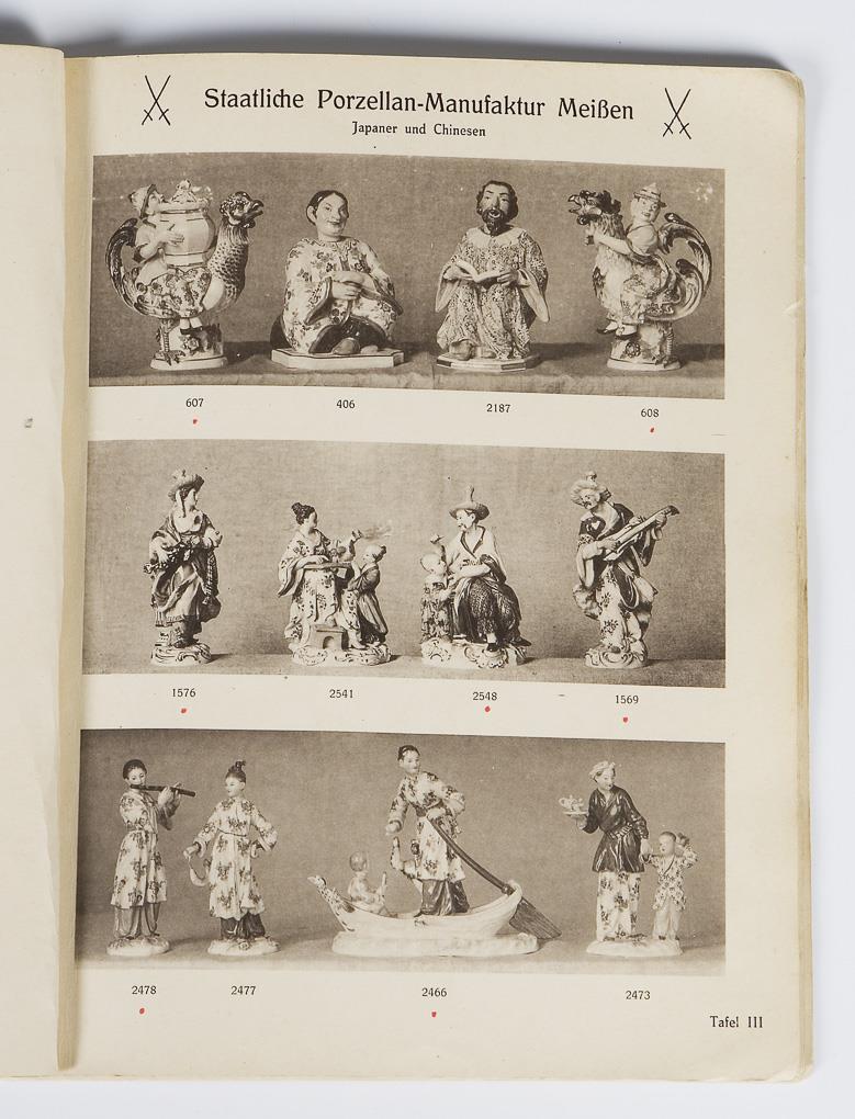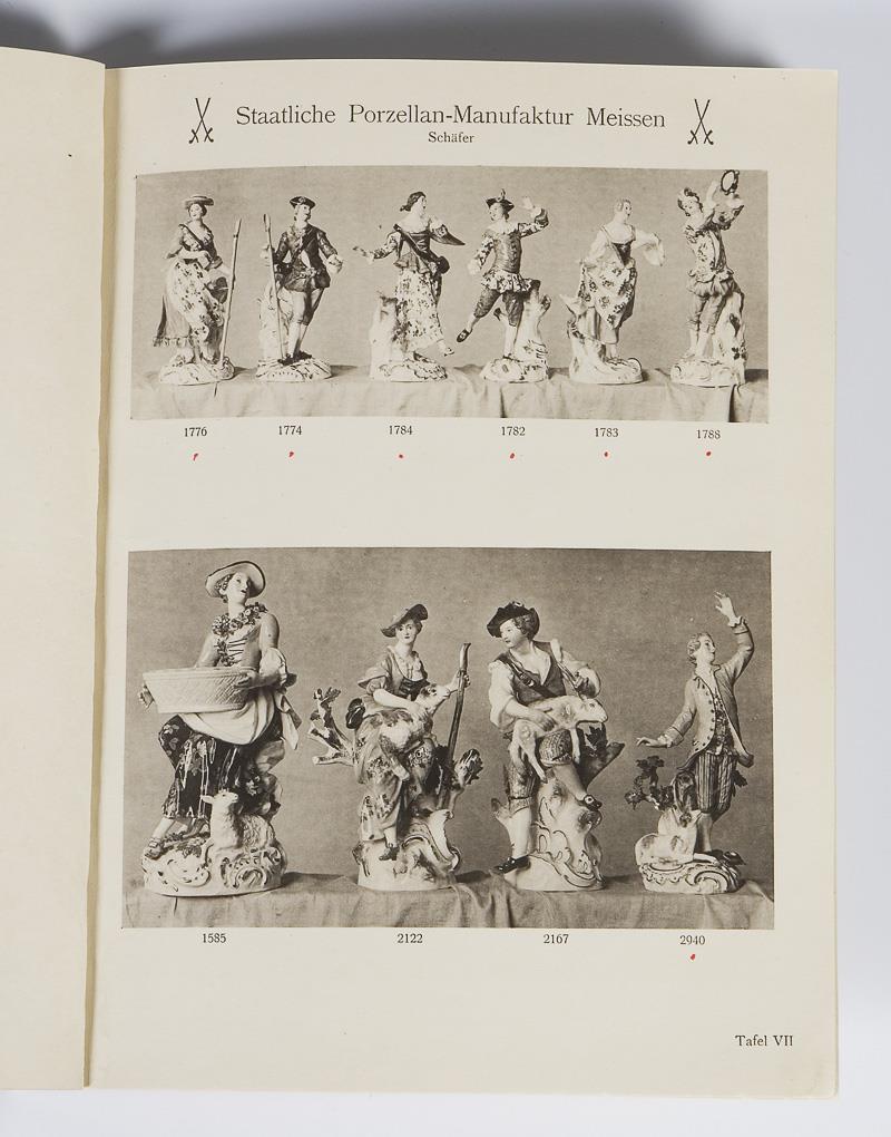 Staatliche Porzellan-Manufaktur Meissen. Knapp 1000 Figuren mit Modell-Nr. auf über 110 Tafeln. "Affenkapelle, Pariser Ausrufer, Verkleidete Amoretten (Devisenkinder)", 161 Figuren auf 7 Tafeln. "Jäger und Wild, Soldaten", 187 Figuren auf 20 Tafeln, mit Preisliste in Kopie. "Hunde", 153 Figuren auf 10 Tafeln, mit Preisliste. "Italienische Komödie", 124 Figuren auf 12 Tafeln, mit Preisliste. "Schäferfiguren und Gruppen", 96 Figuren auf 11 Tafeln, mit Preisliste. "Japaner und Chinesen, Polen, Türken, Mohren", 129 Figuren auf 13 Tafeln, mit Preisliste. "Büsten", 40 Büsten auf 40 Tafeln. Partiell leichte Gebrauchsspuren, rote Punktmarkierungen, zwei Rücken verklebt, insgesamt guter Zustand.