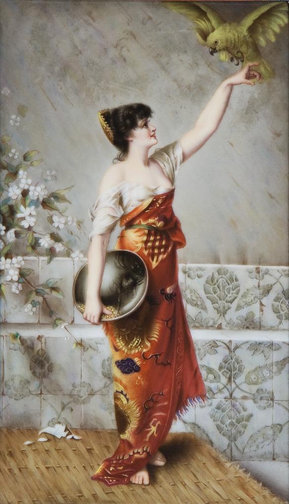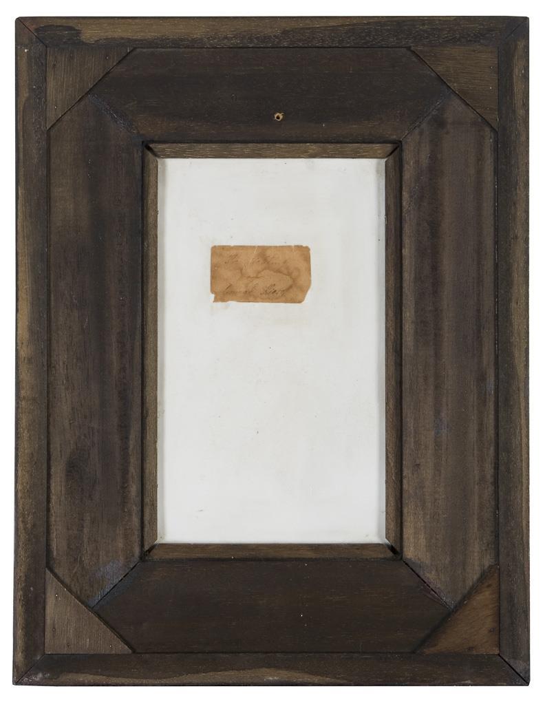 Feine farbige Bemalung nach einer Gemälde-Vorlage von Conrad Kiesel (1846 Düsseldorf - 1921 Berlin), 1884 gemalt, in der Illustrierten Zeitschrift "Moderne Kunst" abgebildet. Unsigniert, rückseitig auf altem Klebezettel bezeichnet. Unglasierter Boden, ohne Marke. Neuwertiger profilierter Flammleisten-Rahmen.