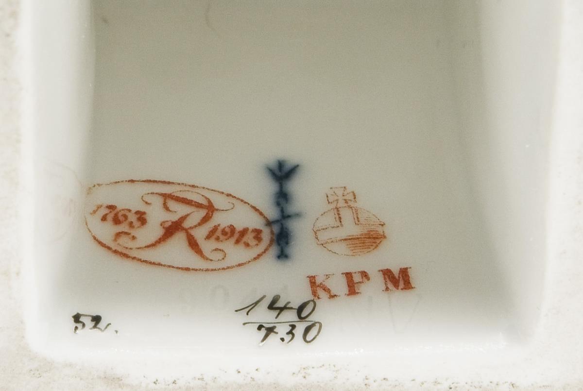 KPM Berlin-Modell von 1908. Farbig bemalt, gold staffiert. Blaue Zeptermarke, rote Reichsapfelmarke, rote Jubiläumsmarke, schwarze, rote und goldene Malermarken, Pressmarke.