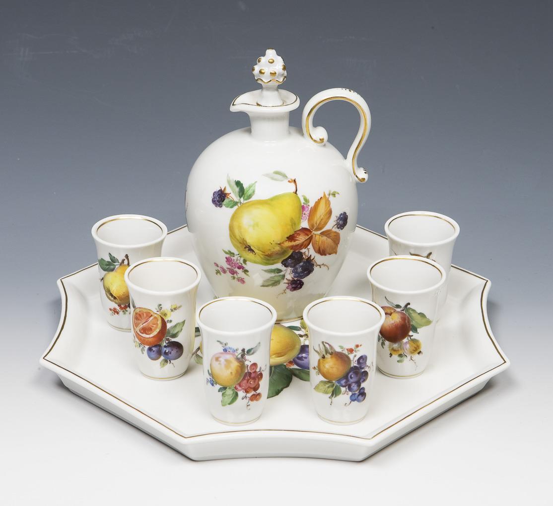8-teiliges Likörservice mit Fruchtmalerei. Meissen.