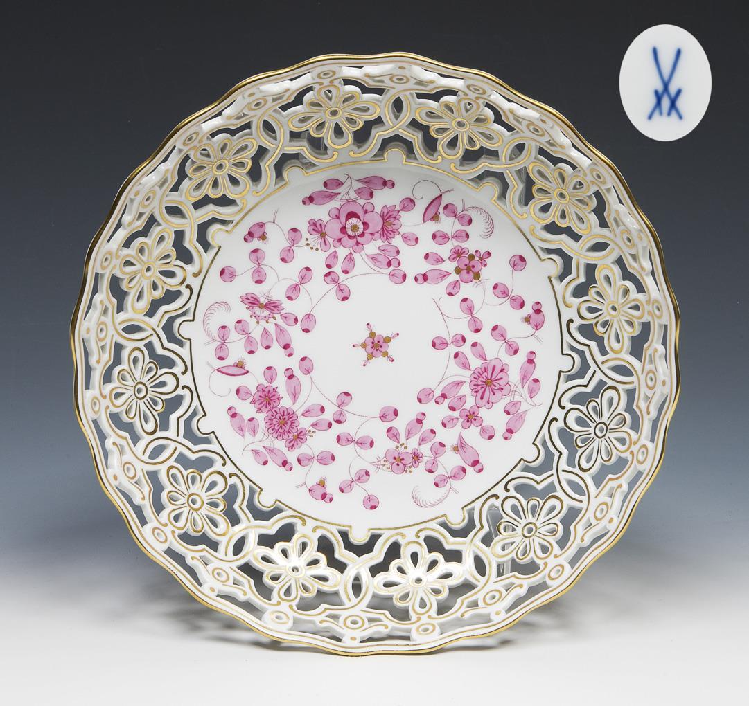 Dekor-Nr. 343412, Wandung floral durchbrochen gearbeitet, Dekor "Indisch Purpur" mit Goldpunkten, gold staffiert. Pressmarken, Malermarken, Schwertermarke.